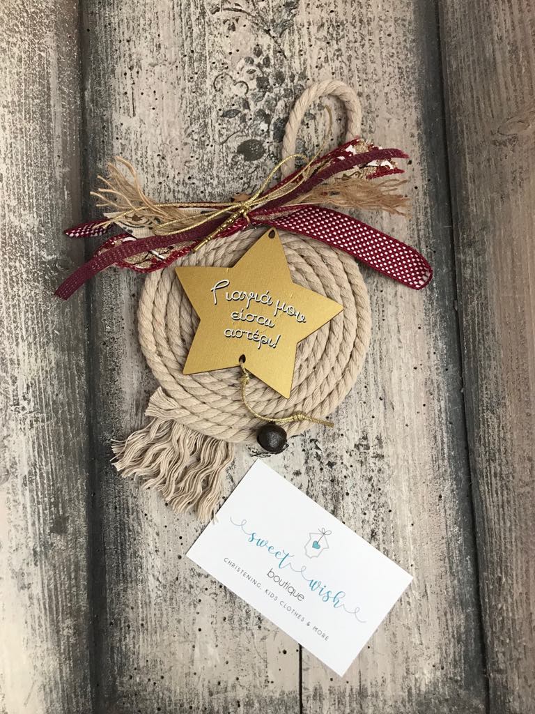 Γούρι για την νέα χρονιά Γιαγιά μου είσαι αστέρι με στριφτό κορδελάκι σε μπεζ χρώμα και ξύλινο διακοσμητικό διακοσμημένο με κορδέλες σε μπορντώ αποχρώσεις.
