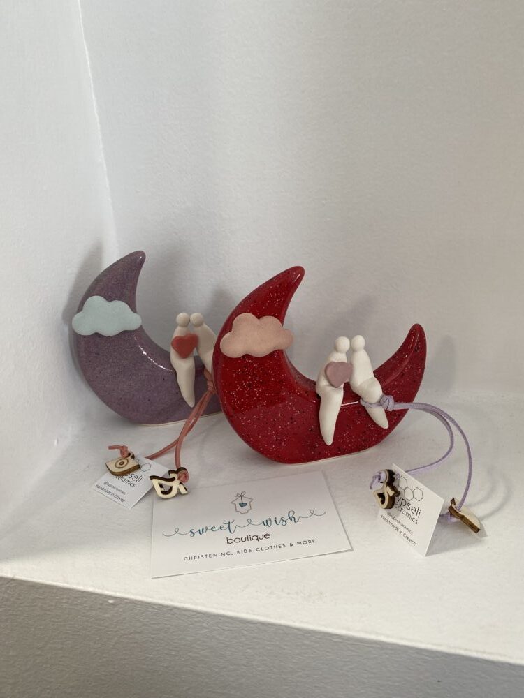 Χειροποίητο κεραμικό επιτραπέζιο γούρι ζευγάρι στο φεγγάρι.