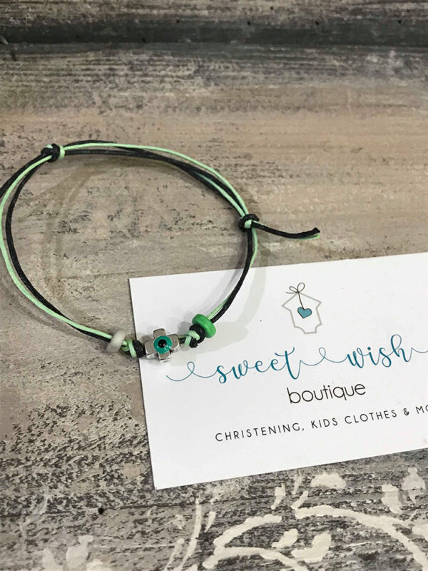 Μαρτυρικό βραχιολάκι δίχρωμο σε ανθρακί και βεραμάν χρώμα με μεταλλικό ασημένιο σταυρουδάκι.