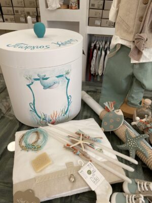 Ολοκληρωμένο βαπτιστικό πακέτο με θαλασσινό θέμα, ιδανικό για μια κομψή, καλοκαιρινή και θεματική βάπτιση. Το σετ περιλαμβάνει όλα τα απαραίτητα είδη για τον νονό/την νονά, με προσεγμένο σχεδιασμό και υψηλή ποιότητα.