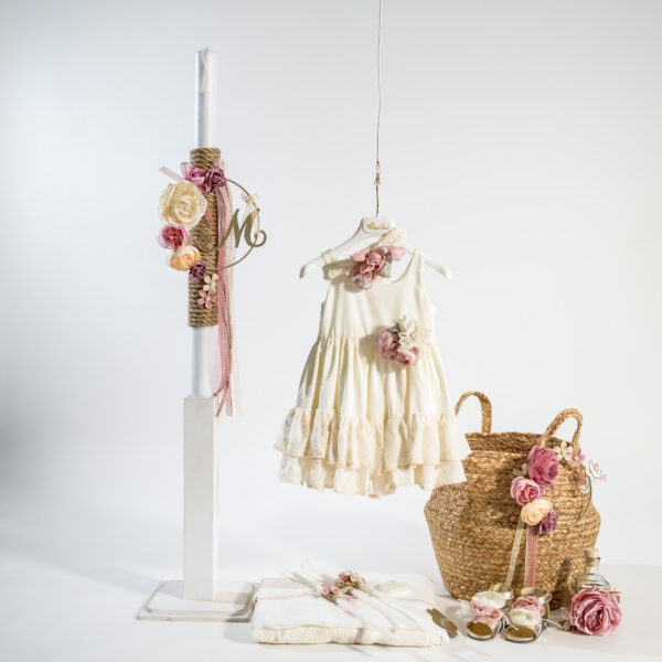 Στην τιμή περιλαμβάνεται η λαμπάδα, to φόρεμα σε νούμερο 12-18, το καλάθι, το λαδοσέτ (μπουκαλάκι λαδιού, σαπουνάκι, 3 κεράκια), τα λαδόπανα , τα παπούτσια ( BABYWALKER EXC5770 σε νούμερο 21) και 50 απλά μαρτυρικά.