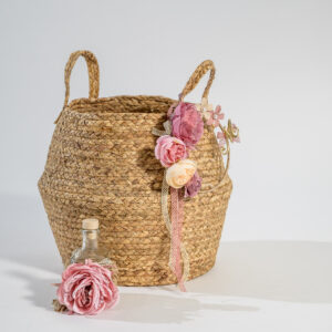 Ολοκληρωμένο βαπτιστικό πακέτο boho με ψάθινο καλάθι και χειροποίητο στεφανάκι από λουλούδια και plexiglass μονόγραμμα.