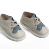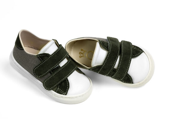 Παπούτσι περπατήματος sneaker από λαδί ύφασμα, λευκό δέρμα και κυπαρισσί καστόρ, κλείσιμο με δυο velcro.