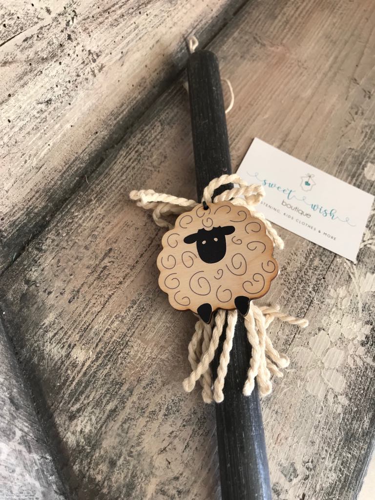 Πασχαλινή αρωματική λαμπάδα με μαύρο ξύλινο πρόβατο και λευκή στριφτή κορδέλα που παραπέμπει σε μαλλί προβάτου.
