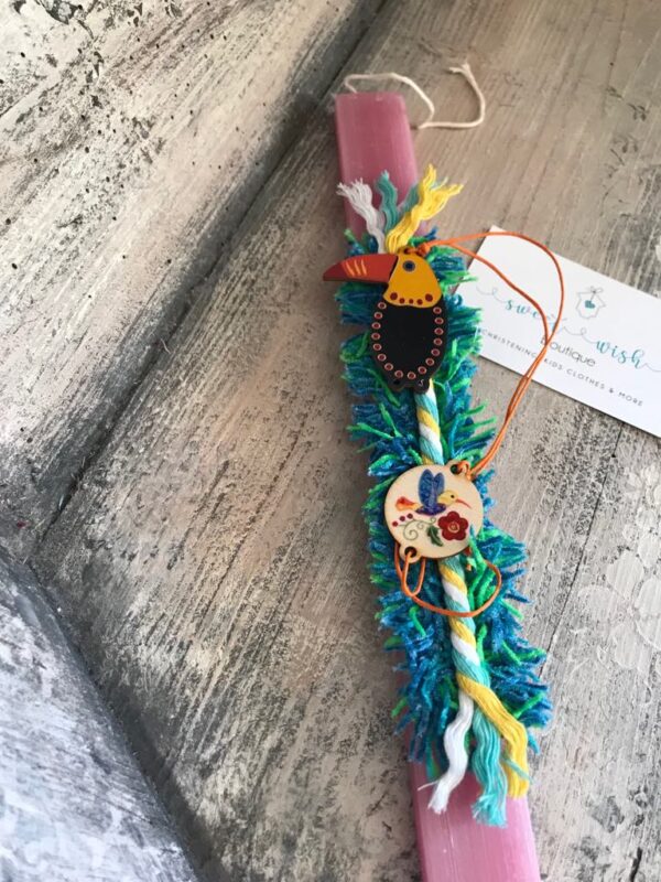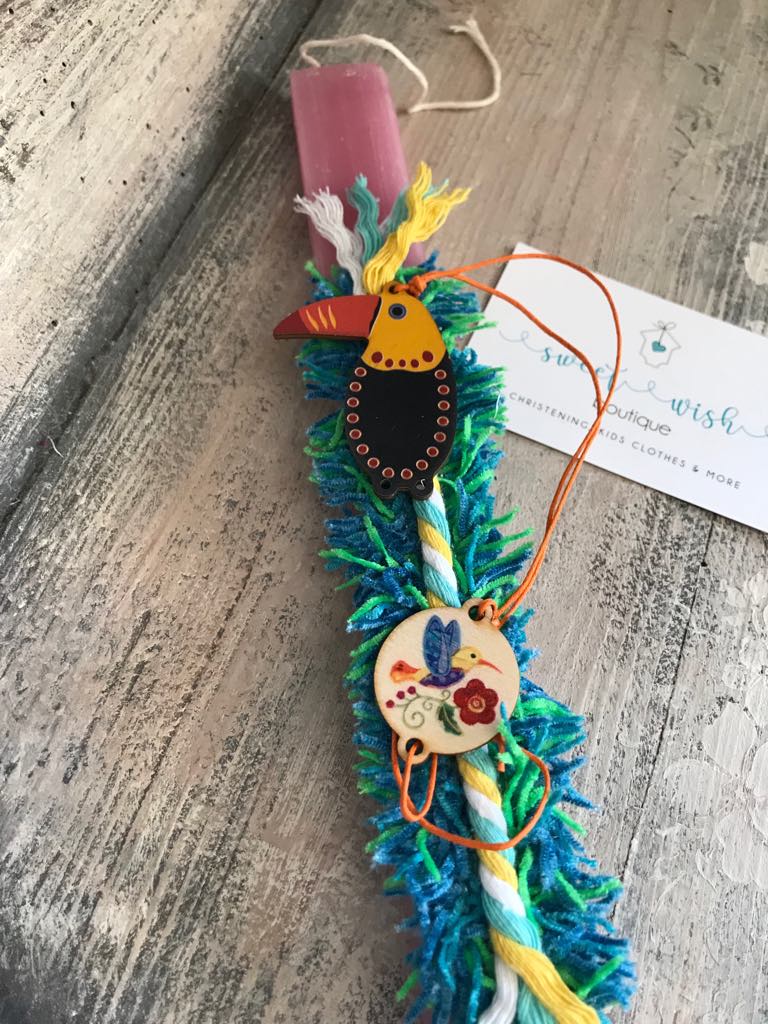 Πασχαλινή αρωματική λαμπάδα με πολύχρωμα εξωτικά πουλιά