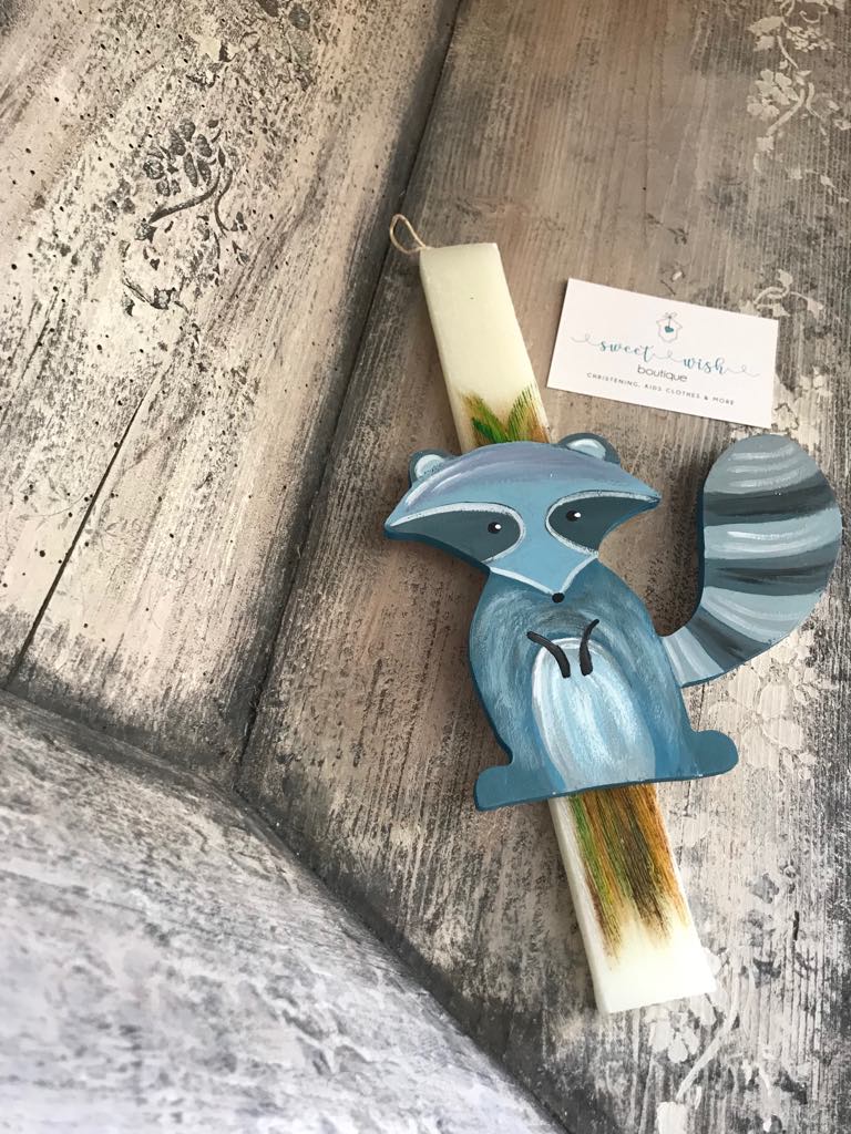 Πασχαλινή αρωματική λαμπάδα με ξύλινο ζωγραφισμένο ρακούν.