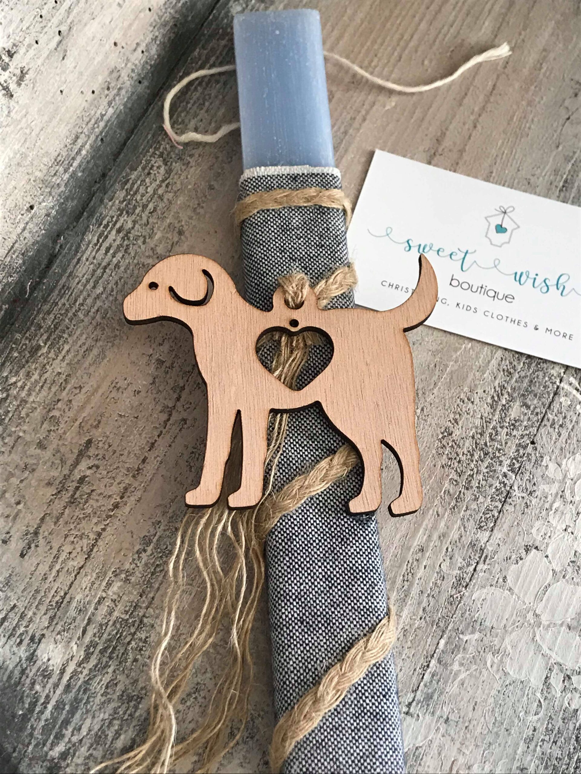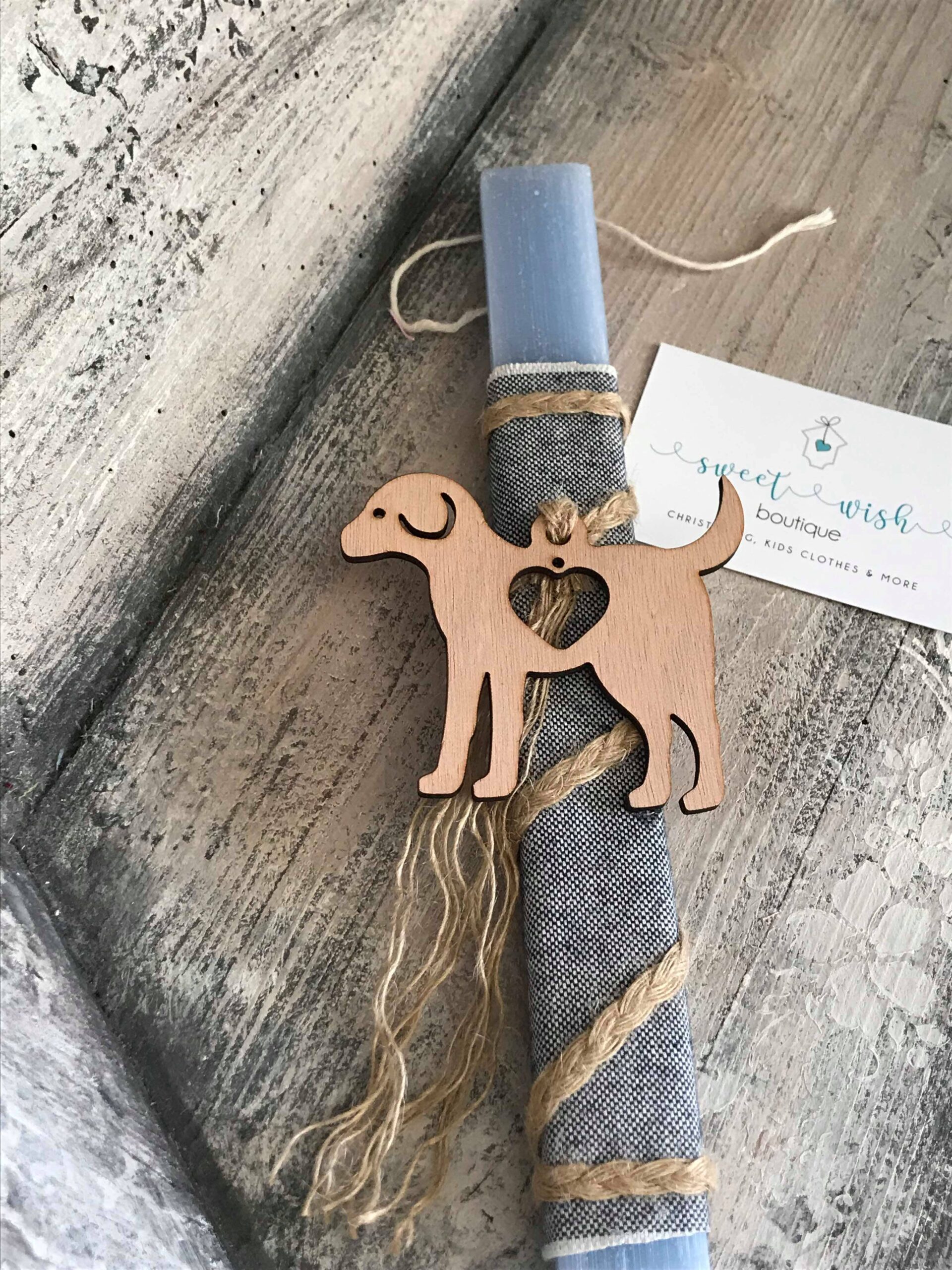 Πασχαλινή αρωματική λαμπάδα με σκυλάκι σε φυσικό ξύλο με μπεζ γιούτα και τζιν ύφασμα.