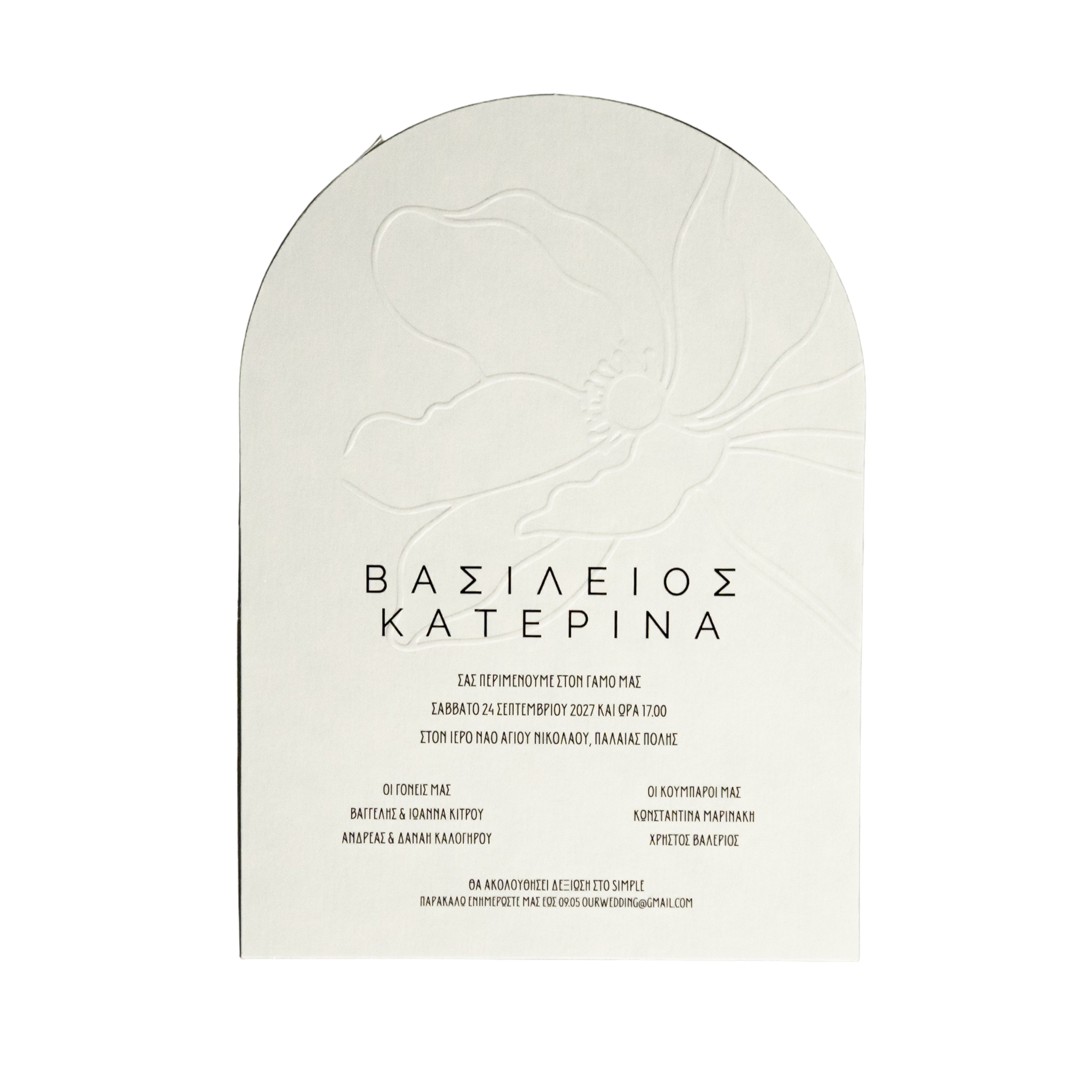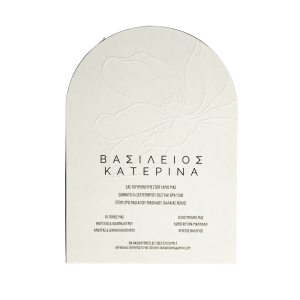 Προσκλητήριο γάμου με ανάγλυφο λουλούδι γκοφρέ, που συνδυάζει ρομαντισμό και κομψότητα. Η διακριτική υφή του ανάγλυφου σχεδίου προσθέτει βάθος και ιδιαίτερο χαρακτήρα, δημιουργώντας ένα εκλεπτυσμένο αποτέλεσμα που εντυπωσιάζει με τη λεπτομέρεια και την απλότητά του.