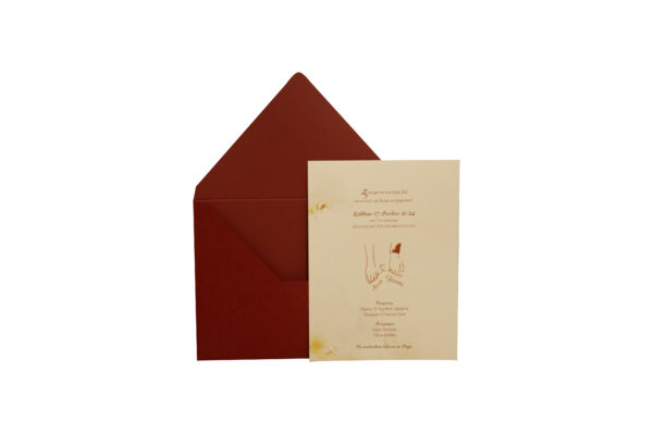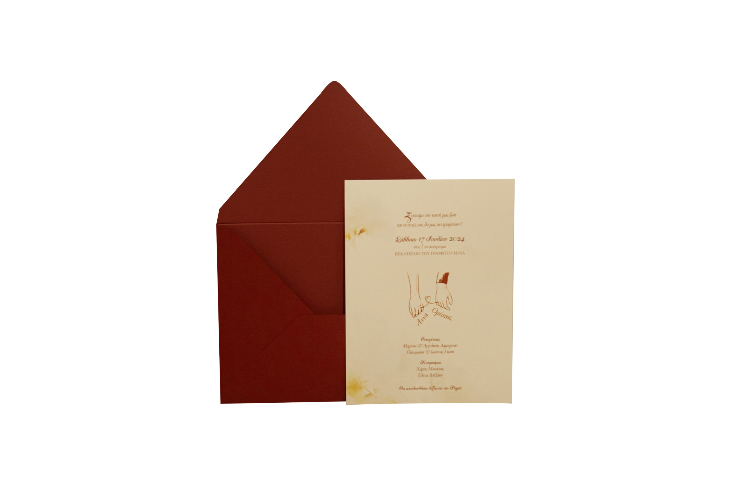 Προσκλητήριο γάμου με χέρια ζευγαριού και μπορντώ φάκελο