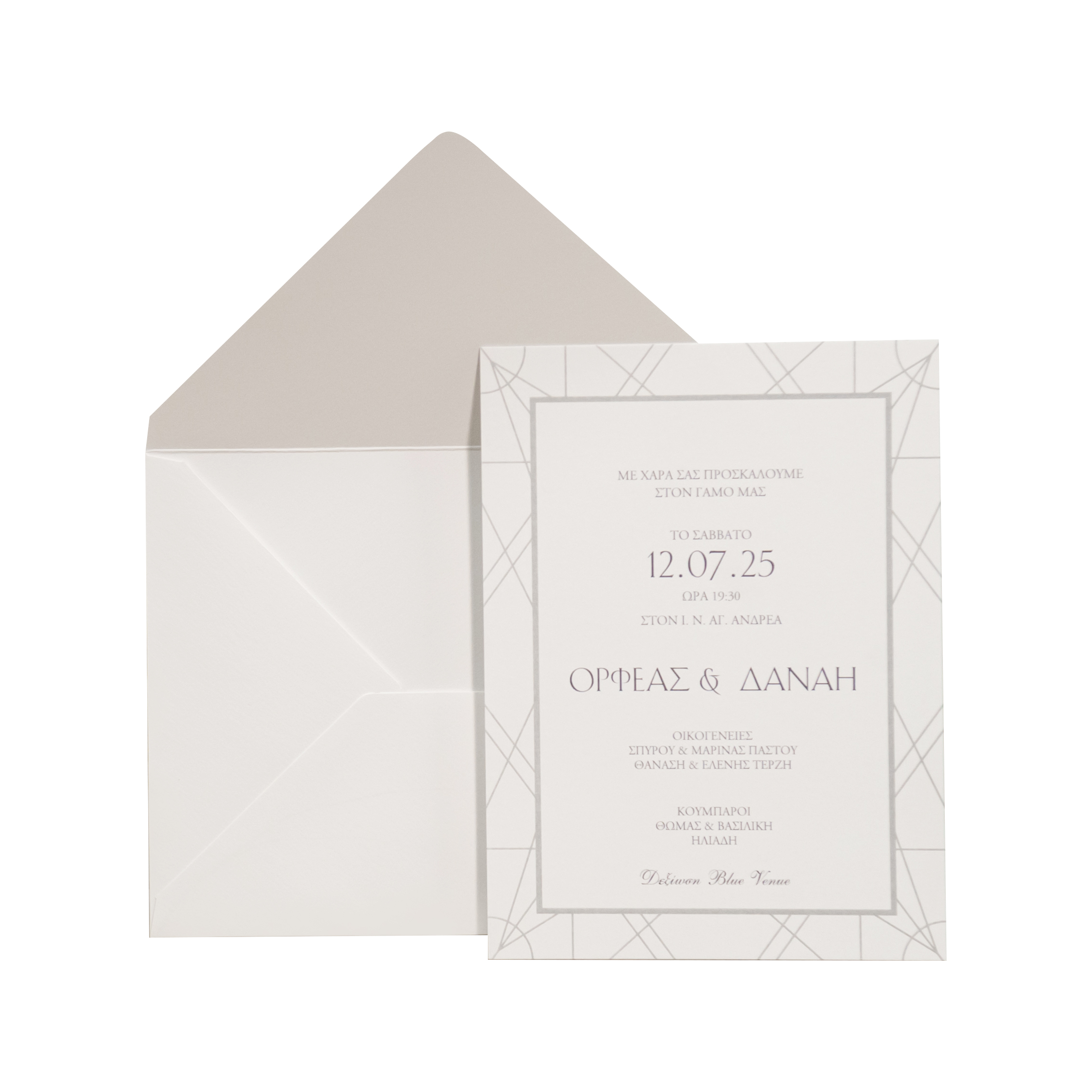 Προσκλητήριο γάμου με γεωμετρικά σχέδια και πλαίσιο.