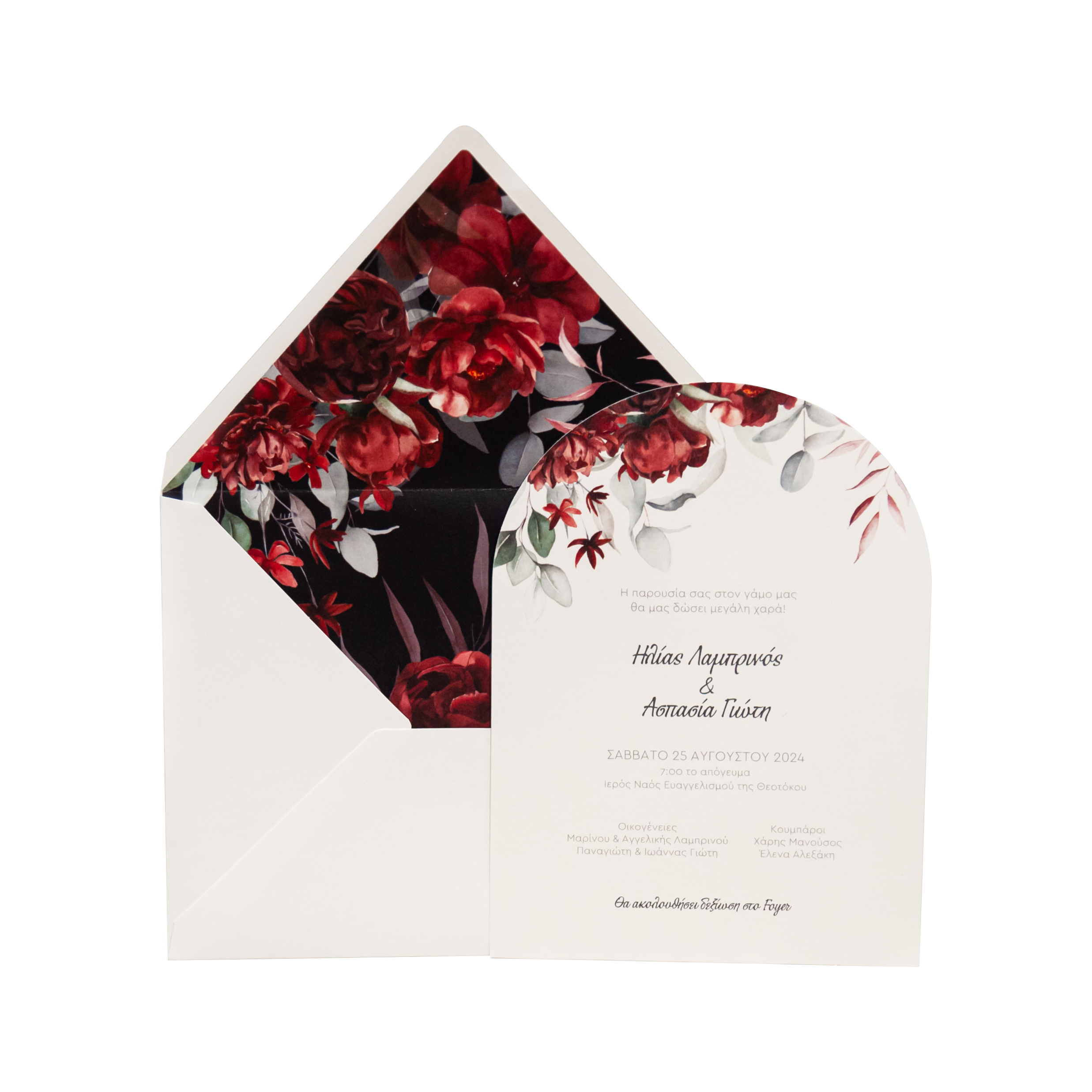 Προσκλητήριο γάμου με λουλουδάκια σε κόκκινες αποχρώσεις.