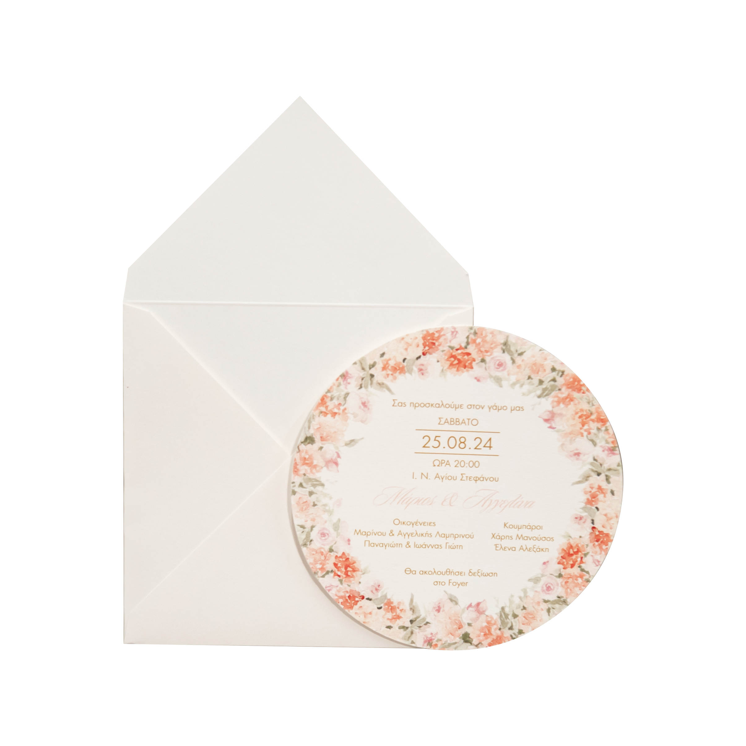 Προσκλητήριο γάμου με λουλουδάκια σε κυκλικό προσκλητήριο