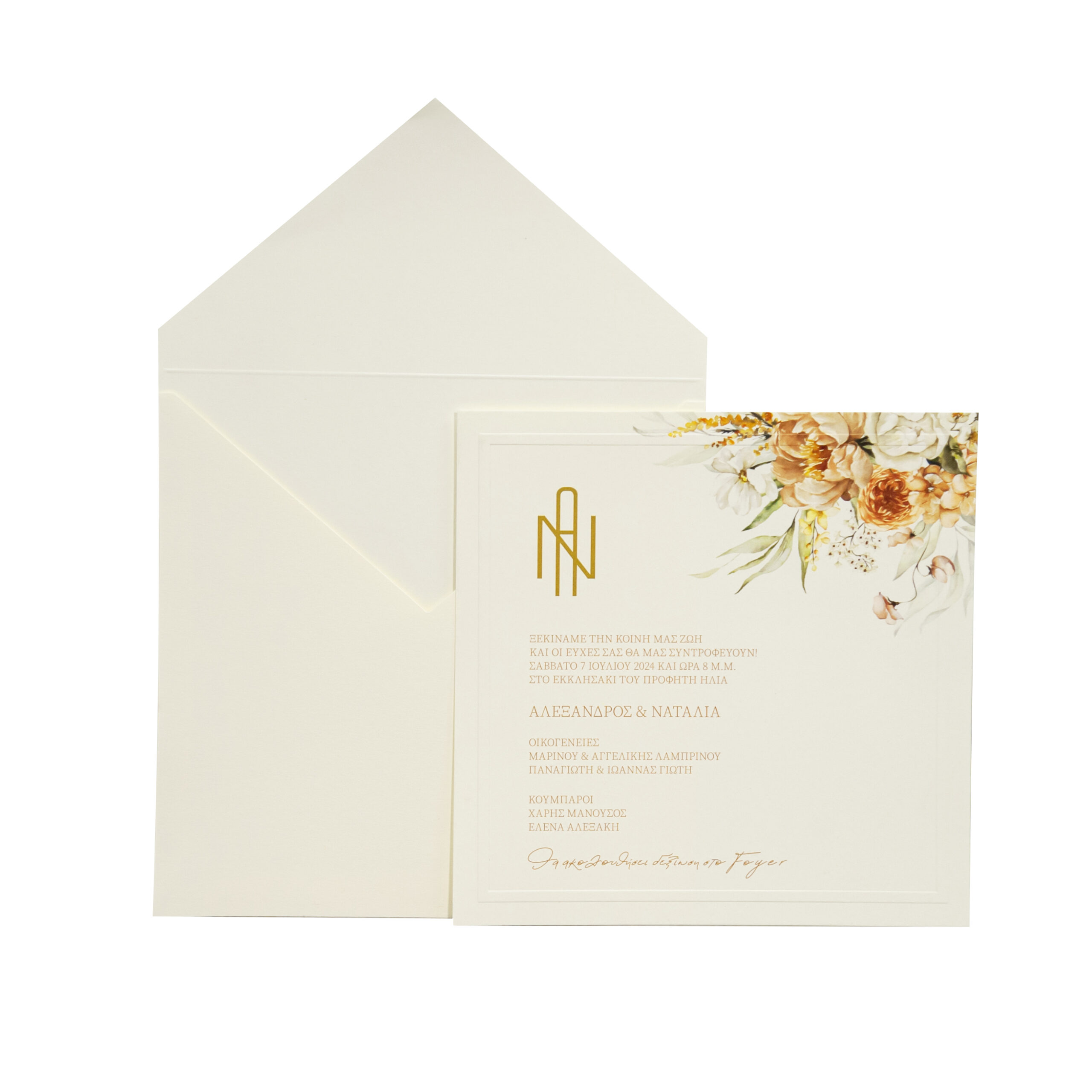 Προσκλητήριο γάμου με λουλούδια σε πορτοκαλί αποχρώσεις.