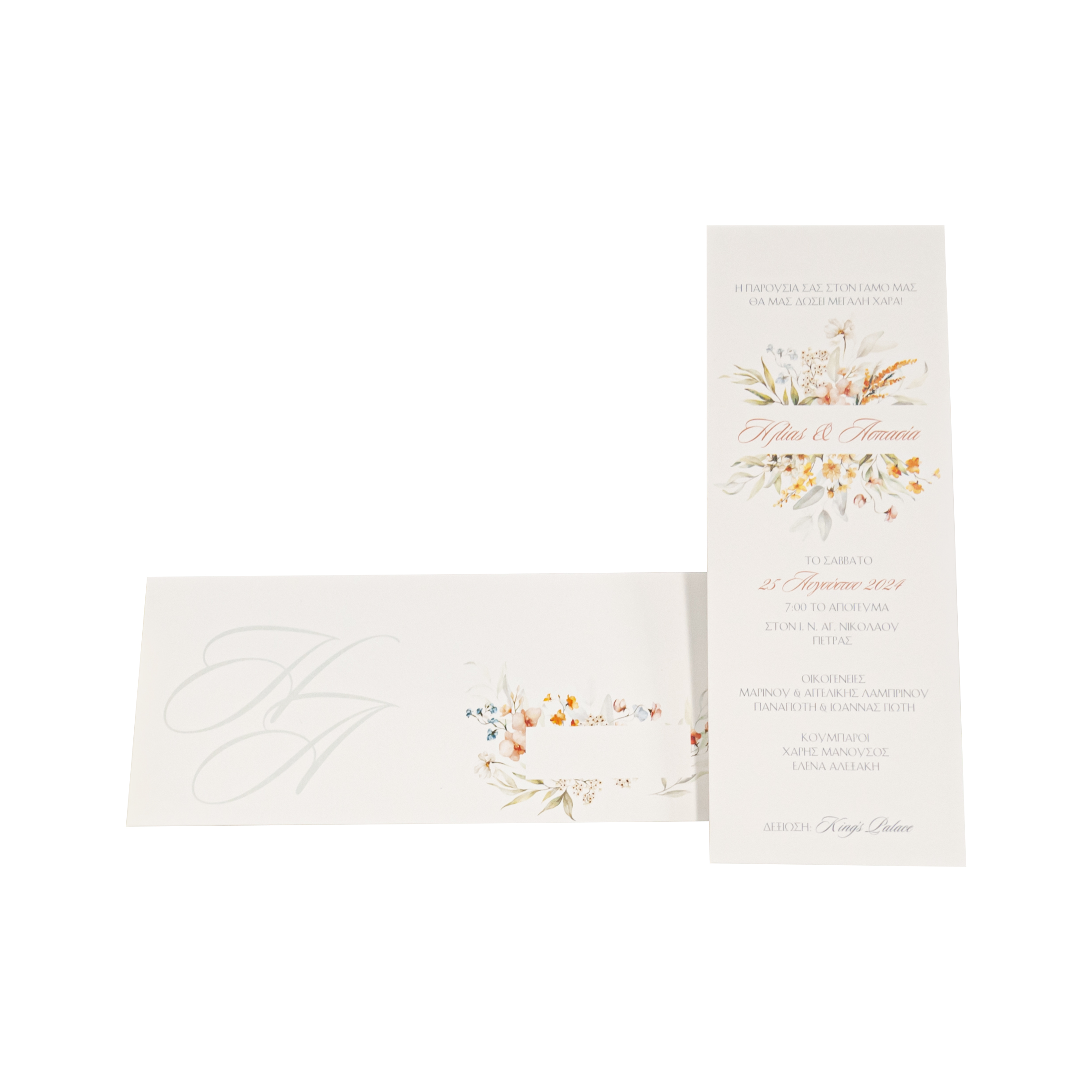 Προσκλητήριο γάμου με μαργαρίτες και εκτύπωση στον φάκελο.