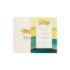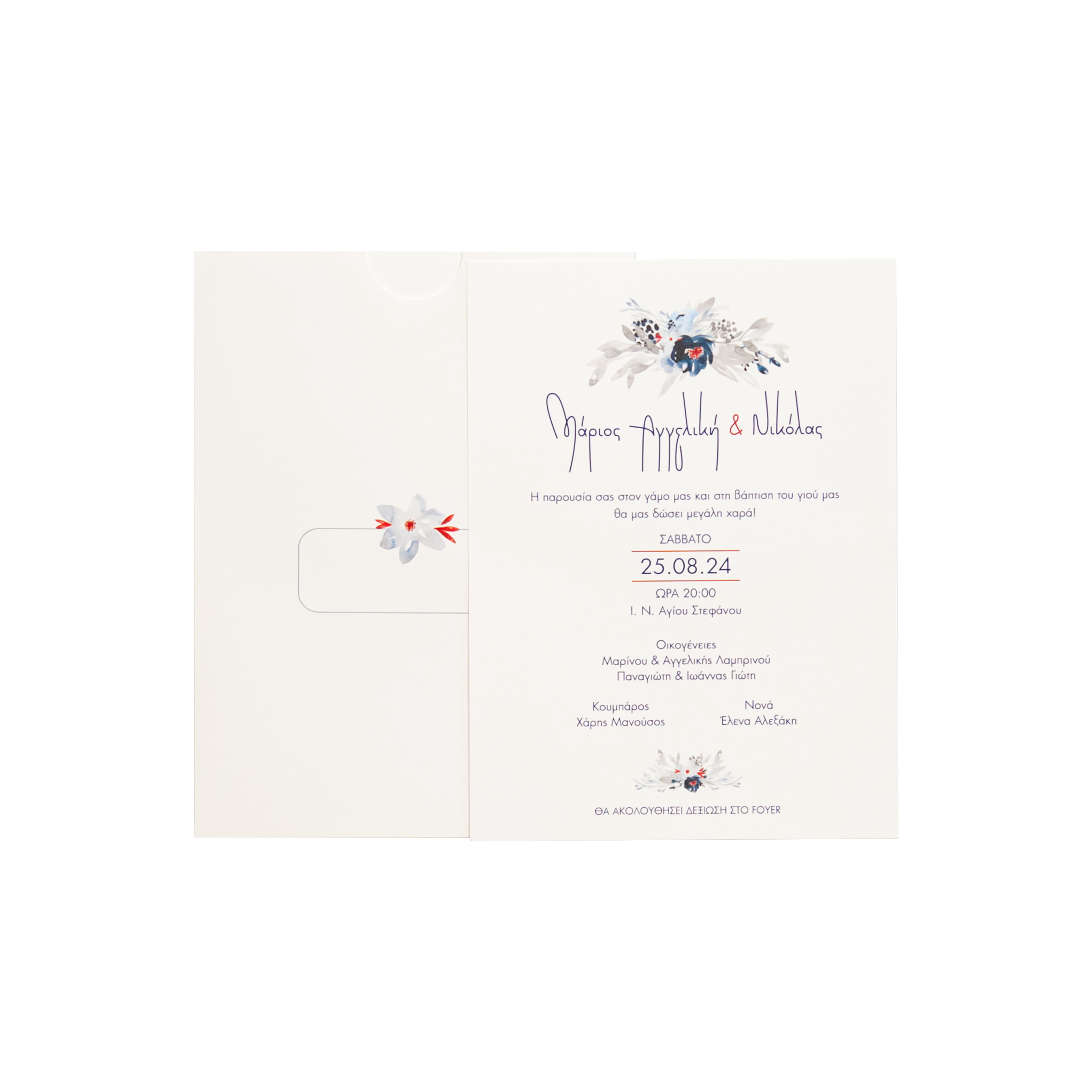 Προσκλητήριο γάμου με σύνθεση λουλουδιών σε μπλε αποχρώσεις.