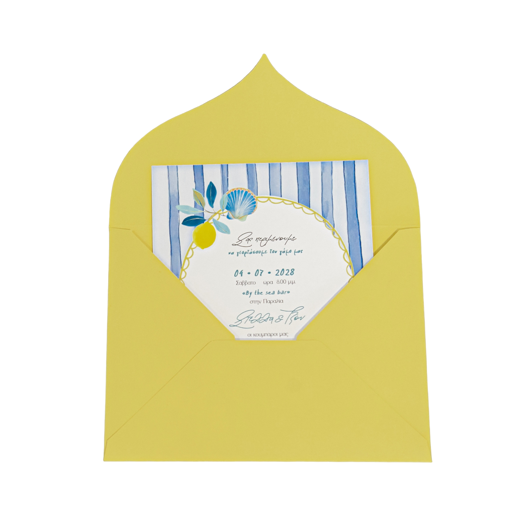 Προσκλητήριο γάμου με θέμα το λεμόνι, σε δροσερούς συνδυασμούς μπλε και κίτρινων αποχρώσεων, που αποπνέουν καλοκαιρινή φρεσκάδα και ζωντάνια. Τα λεμονάκια και οι φωτεινές λεπτομέρειες δίνουν έναν ανάλαφρο, μεσογειακό χαρακτήρα, ενώ το μπλε προσθέτει κομψότητα και ισορροπία.