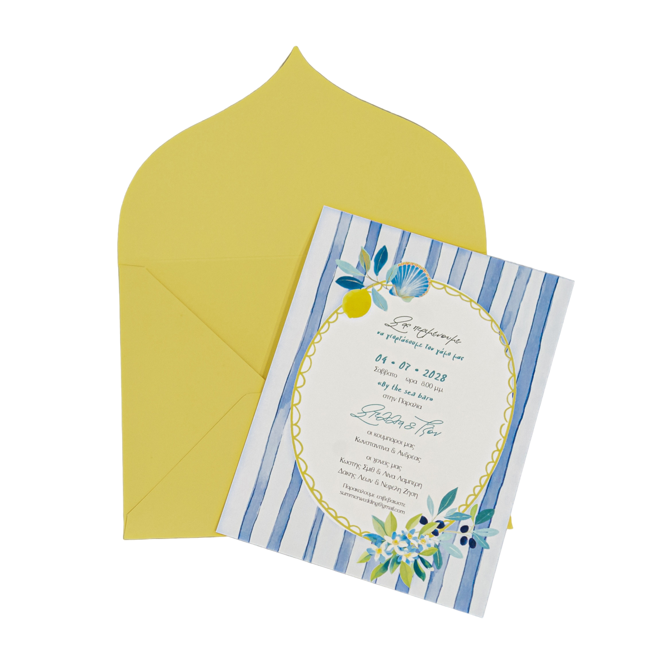 Προσκλητήριο γάμου με θέμα λεμόνι με μπλε- κίτρινες αποχρώσεις
