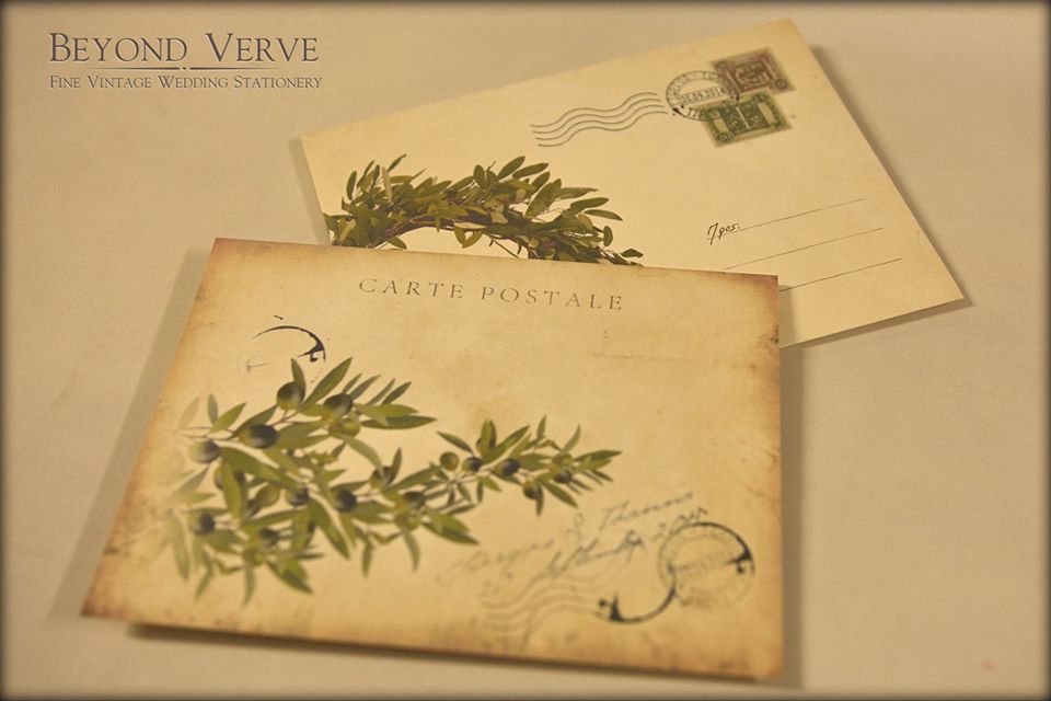 Προσκλητήριο γάμου με θέμα την ελιά τύπου carte postale .