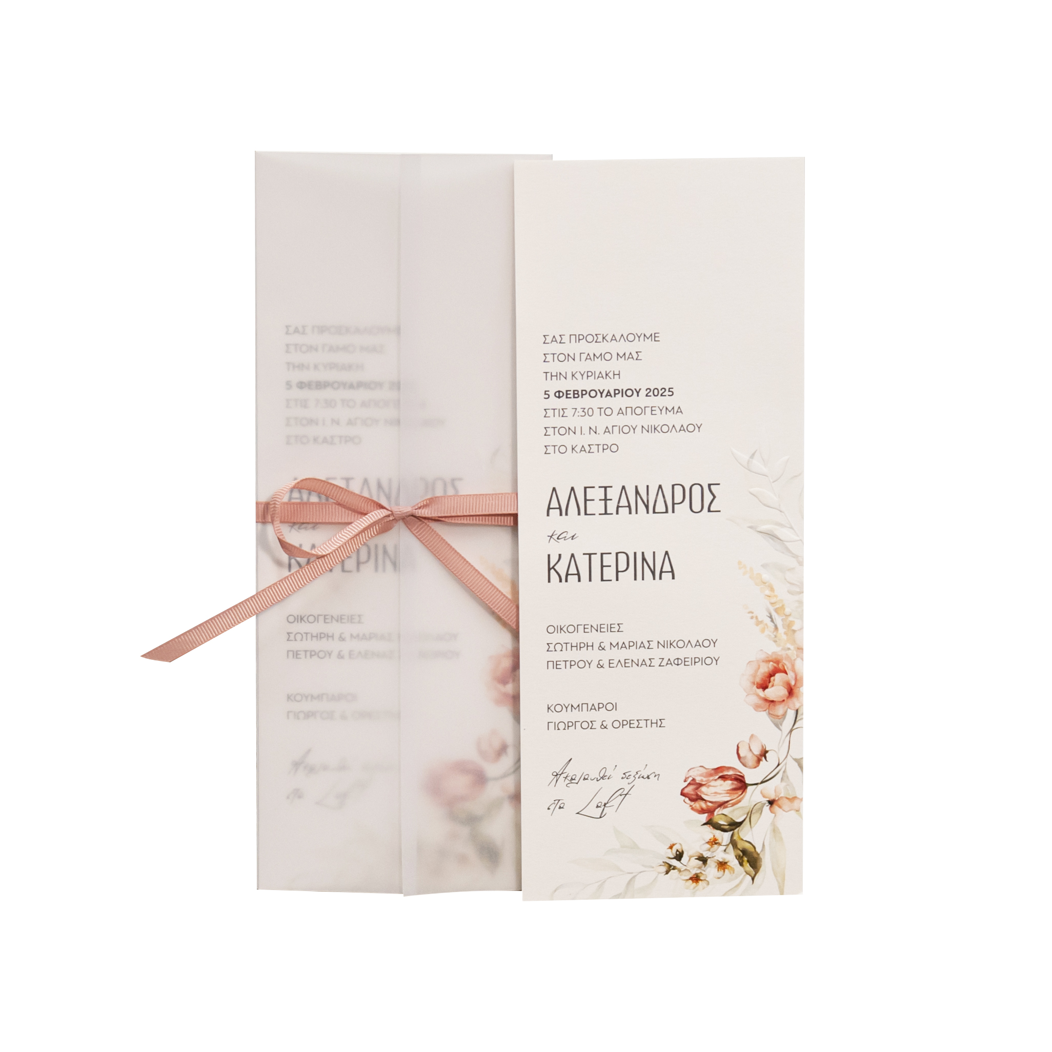 Προσκλητήριο γάμου με τριαντάφυλλα και ριζόχαρτο για φάκελο.
