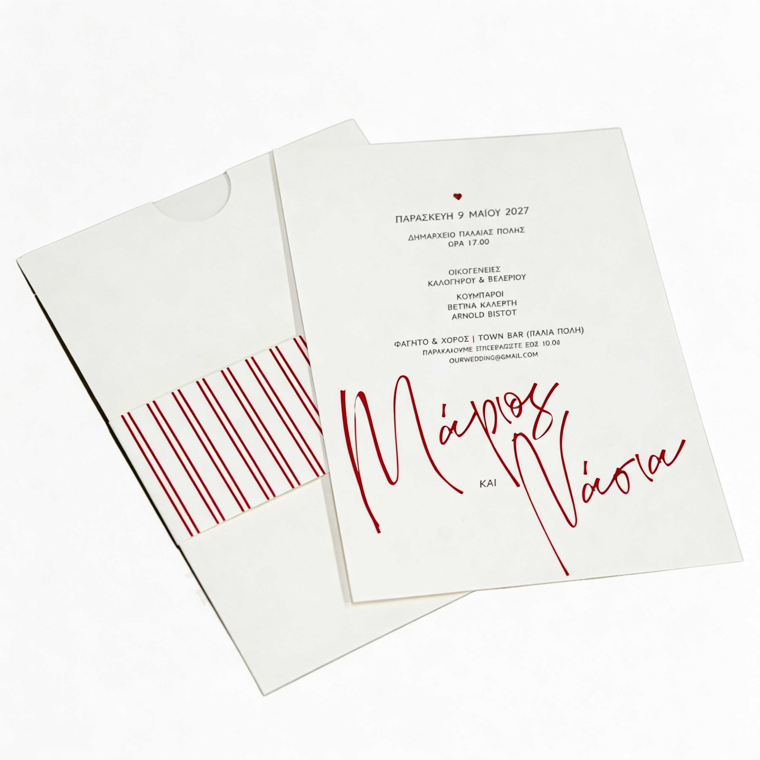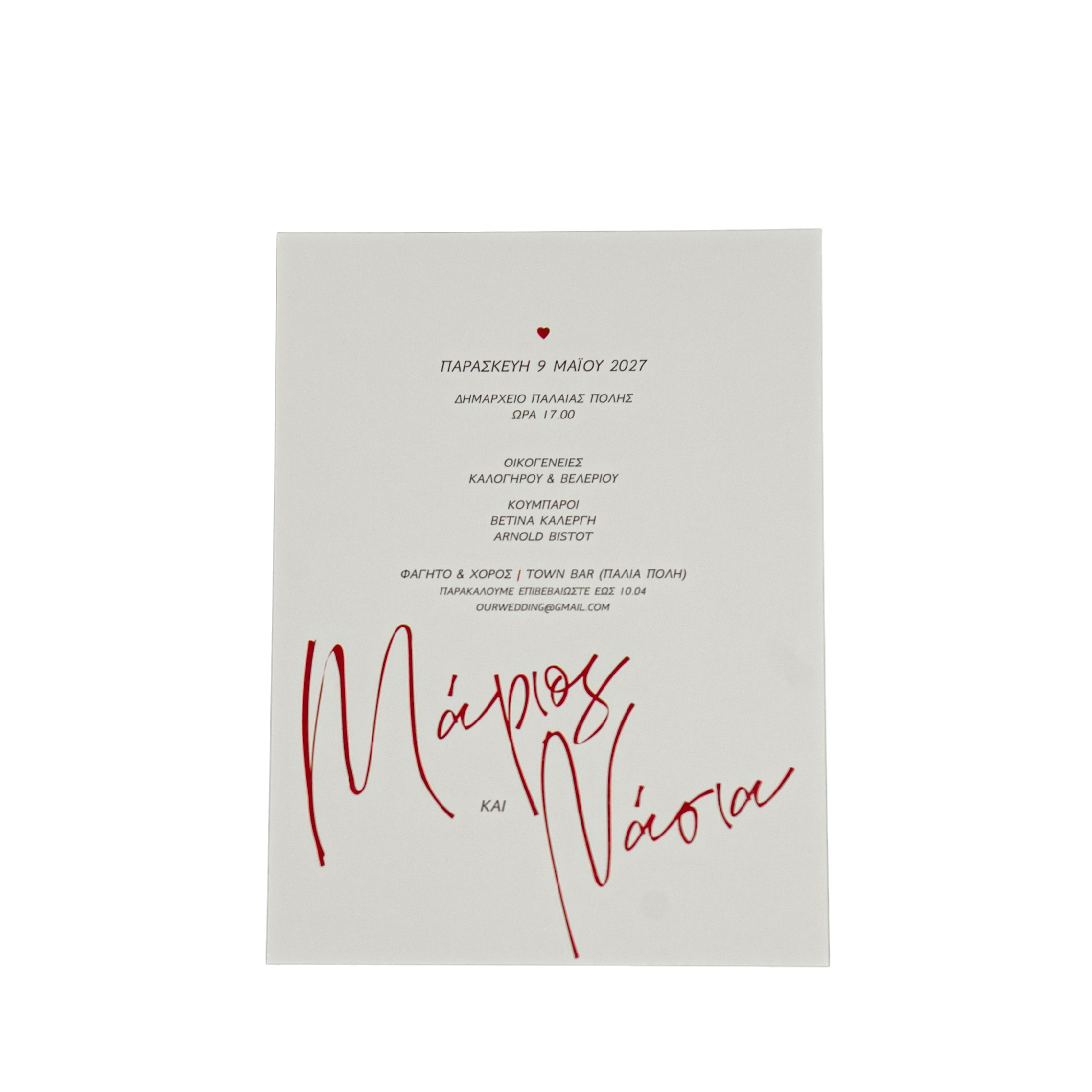 Προσκλητήριο γάμου μινιμαλ με κόκκινα γράμματα