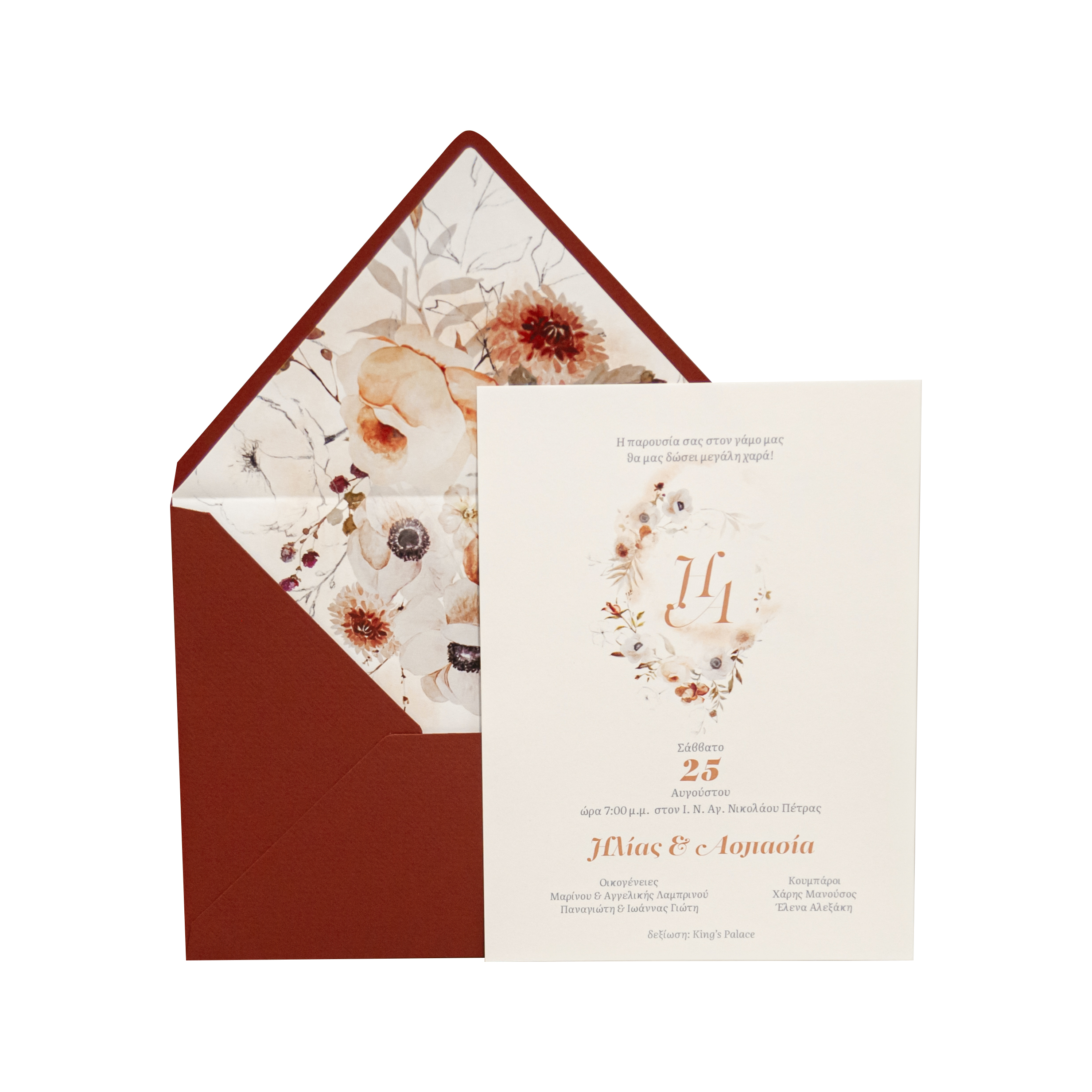 Προσκλητήριο γάμου σε μπορντώ και πορτοκαλί αποχρώσεις και εσωτερική επένδυση φακέλου.