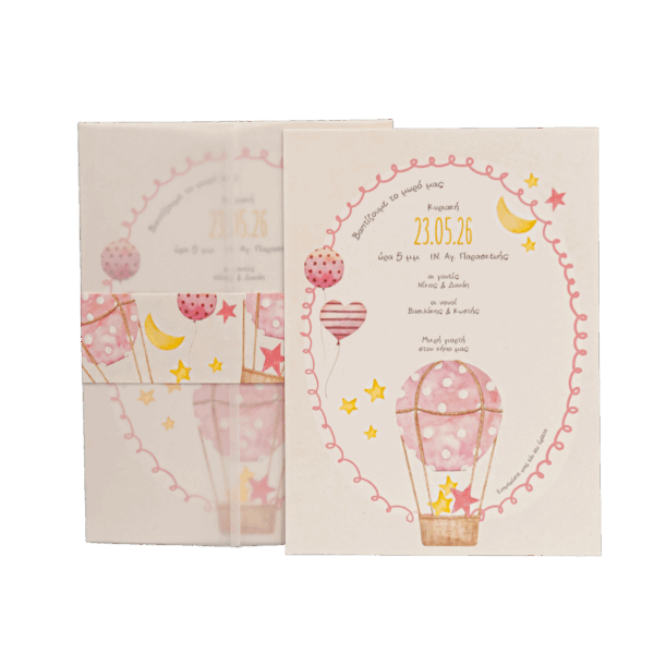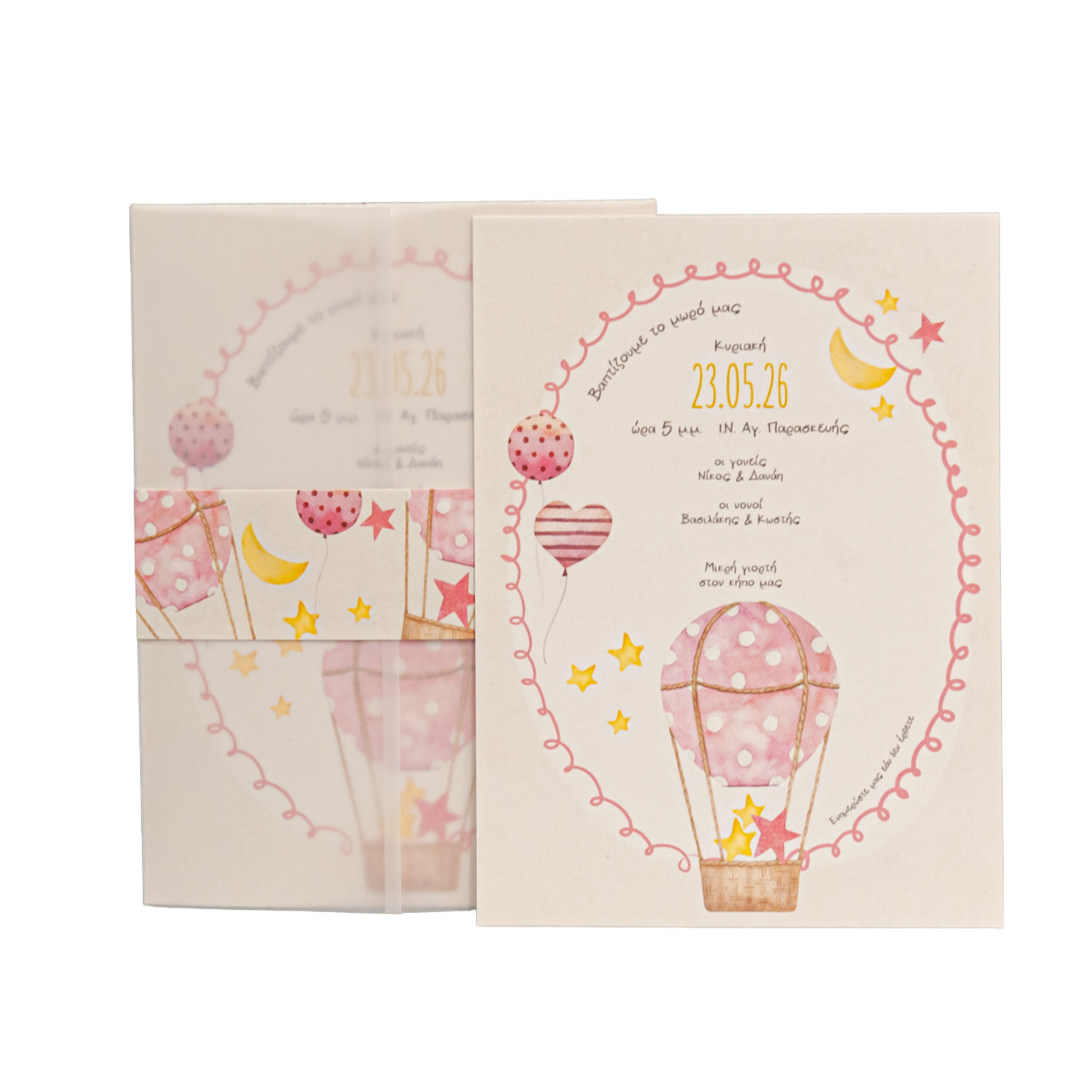 Προσκλητήριο βάπτισης για κορίτσι με θέμα αερόστατο