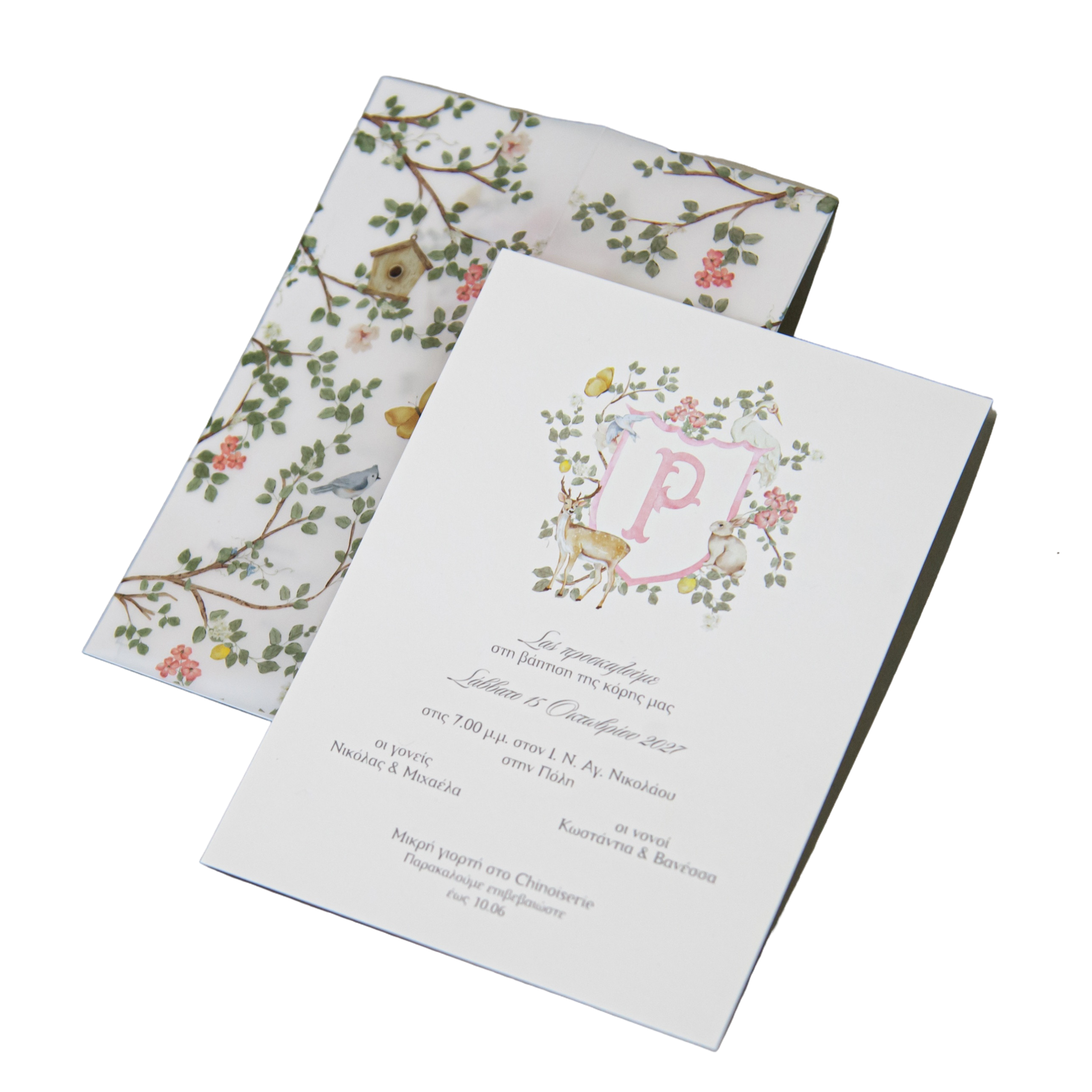 Το σχέδιο συνδυάζει ένα διακριτικό και όμορφο οικόσημο με χαριτωμένα ζωάκια όπως λαγουδάκια, πουλάκια και πεταλούδες, δημιουργώντας μια ατμόσφαιρα γλυκύτητας, τρυφερότητας και αριστοκρατικής γοητείας.