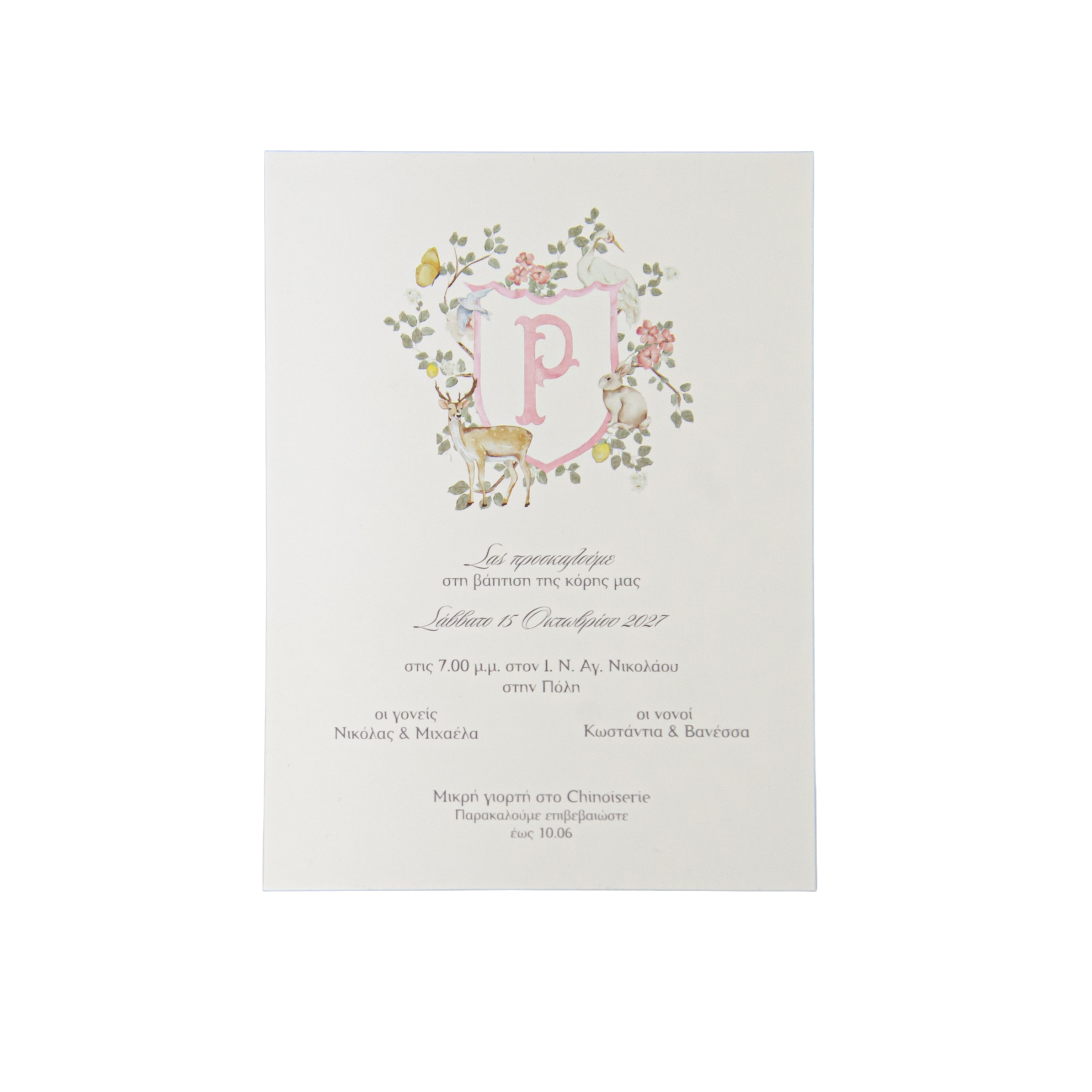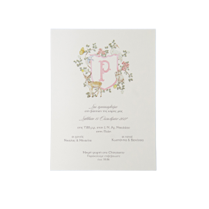 Προσκλητήριο βάπτισης για κορίτσι με θέμα οικόσημο και ζωάκια, ιδανικό για μια κομψή, παραμυθένια και παιχνιδιάρικη εκδήλωση.
