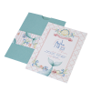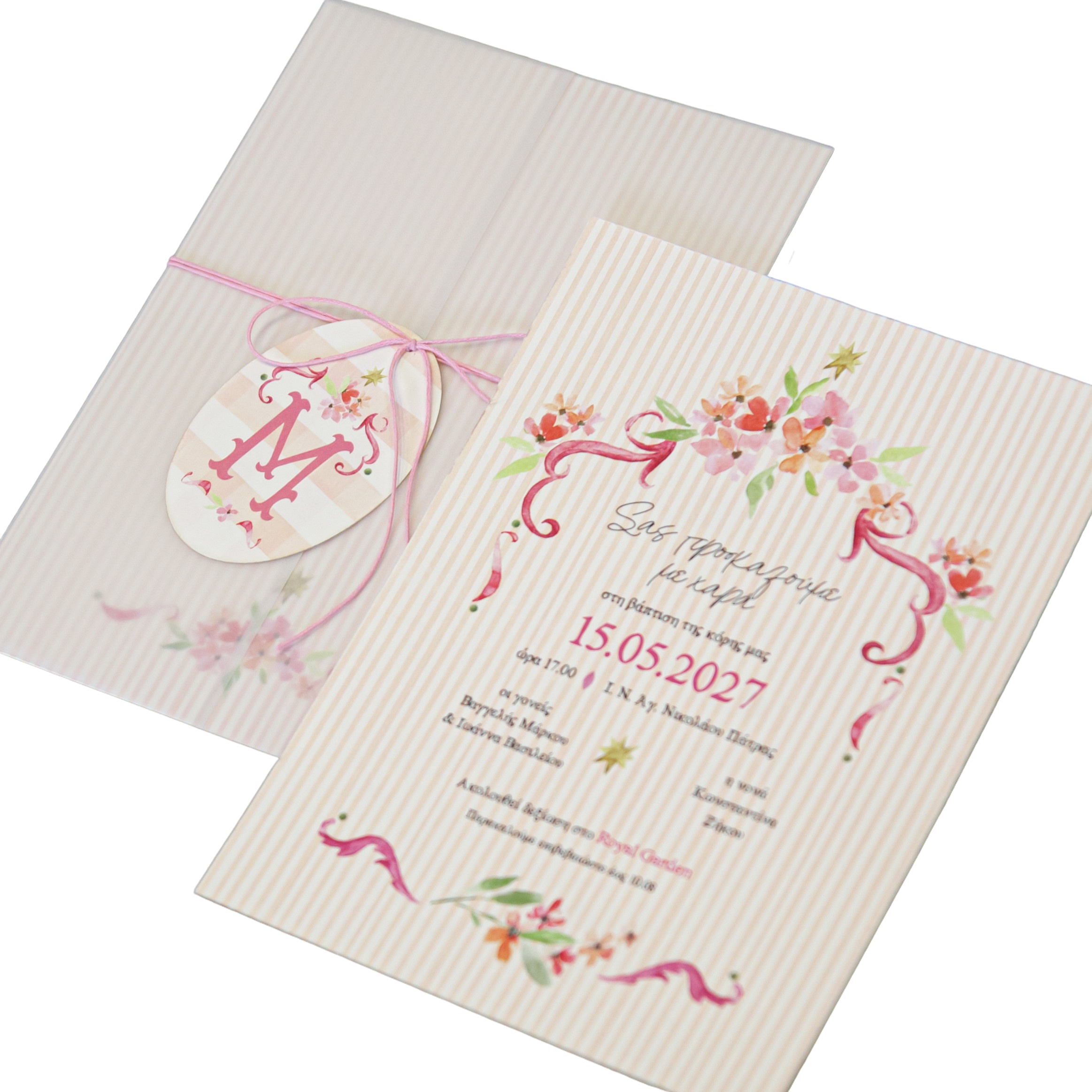 Προσκλητήριο βάπτισης για κορίτσι με θέμα έντονα λουλούδια και ριζόχαρτο φάκελο.