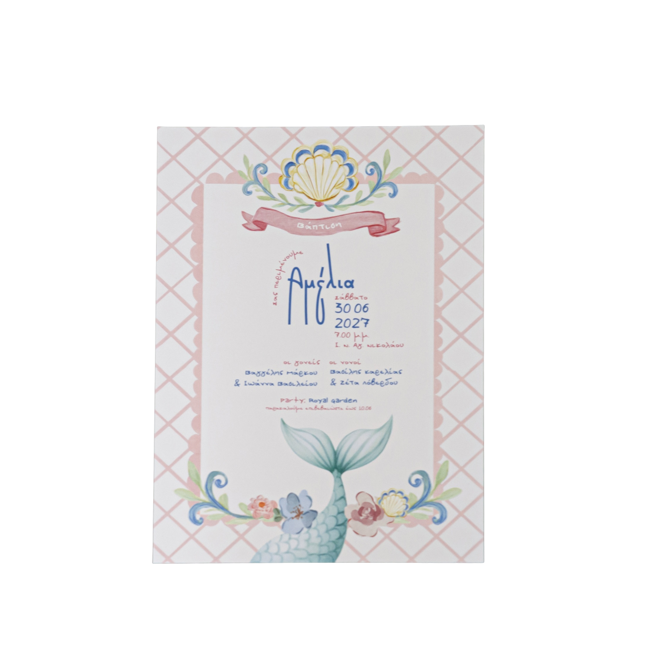Προσκλητήριο βάπτισης για κορίτσι με θέμα γοργόνα, ιδανικό για μια παραμυθένια και μαγική εκδήλωση. Το σχέδιο περιλαμβάνει μια ουρά γοργόνας, κοχύλια, αστραφτερές λεπτομέρειες και κύματα, δημιουργώντας μια ατμόσφαιρα γεμάτη φαντασία, τρυφερότητα και θαλασσινή μαγεία.