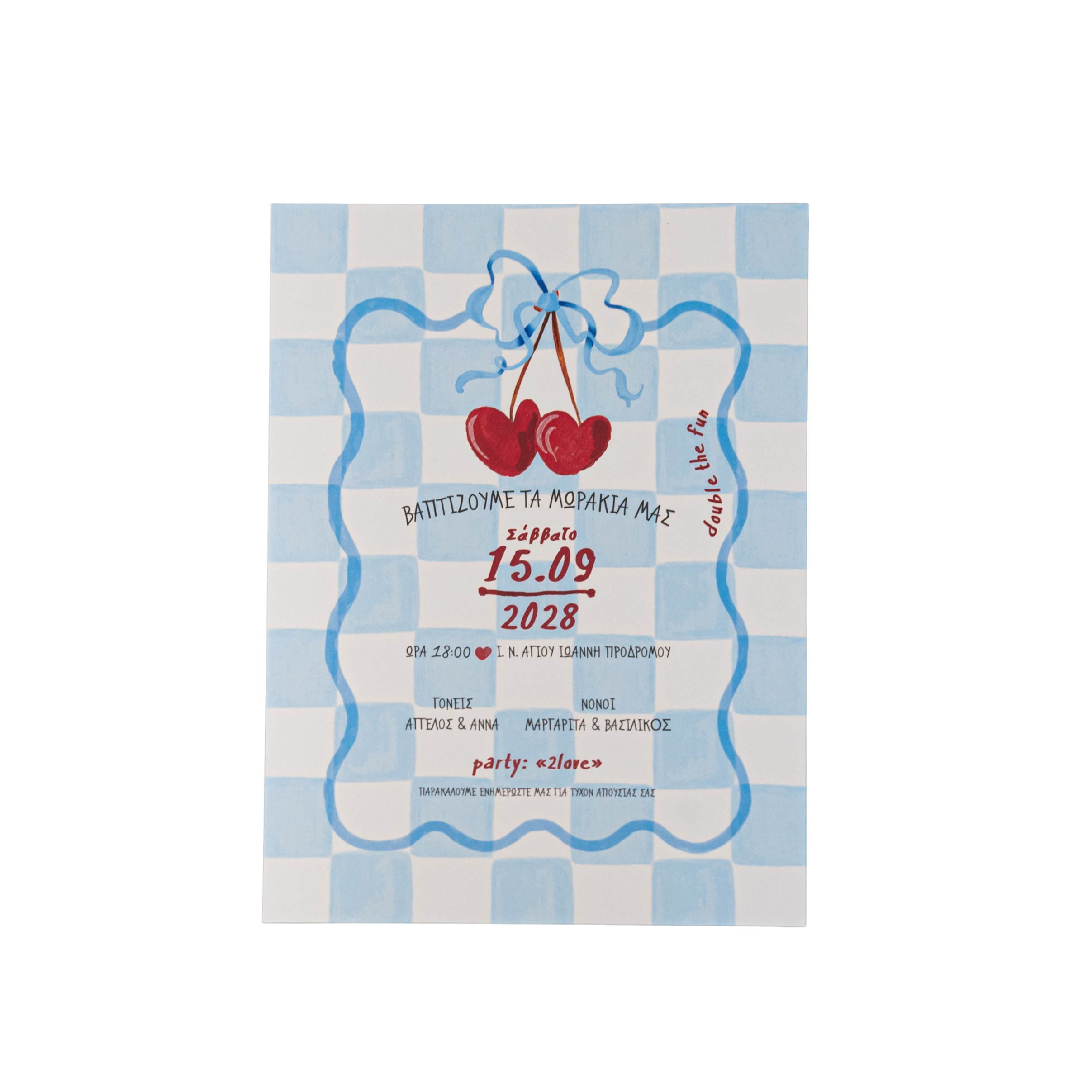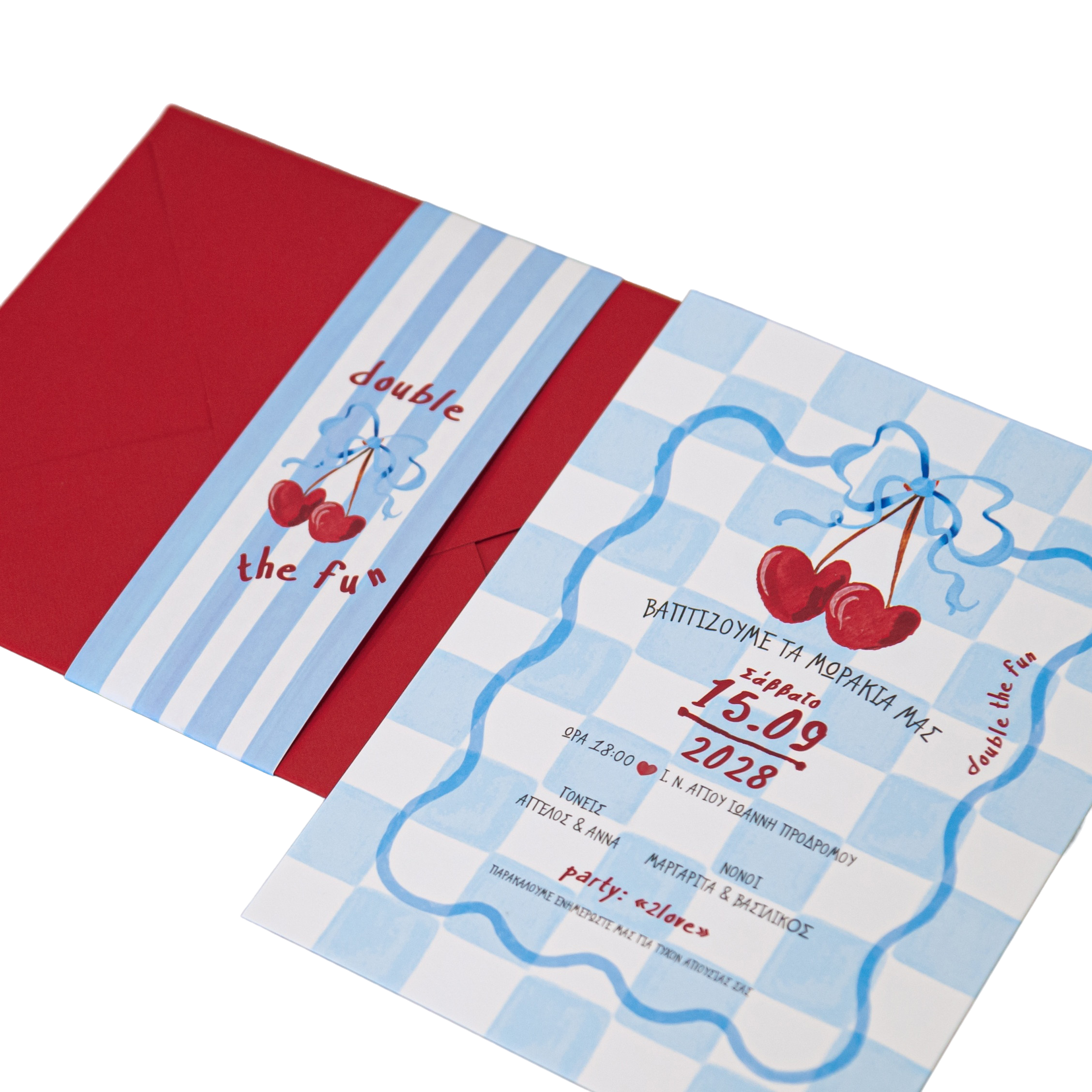 Προσκλητήριο βάπτισης για δίδυμα κορίτσια με θέμα κεράσι.