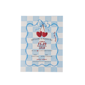Προσκλητήριο βάπτισης για κορίτσι με θέμα κεράσι, ιδανικό για μια γλυκιά, χαρούμενη και ανοιξιάτικη εκδήλωση. Το σχέδιο περιλαμβάνει ζουμερά κεράσια και παιχνιδιάρικα στοιχεία, δημιουργώντας μια φωτεινή και τρυφερή ατμόσφαιρα γεμάτη χαμόγελα και αθωότητα.