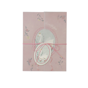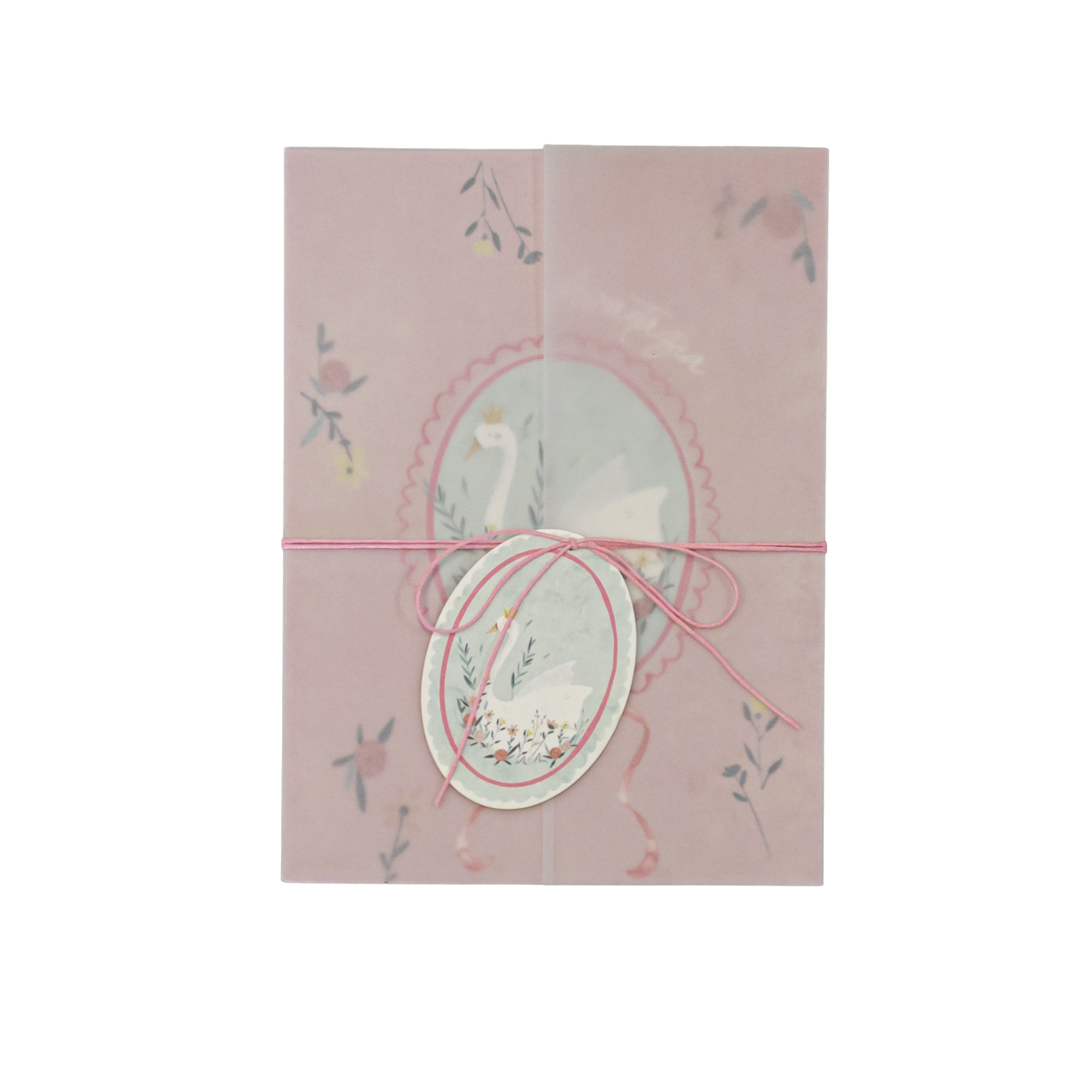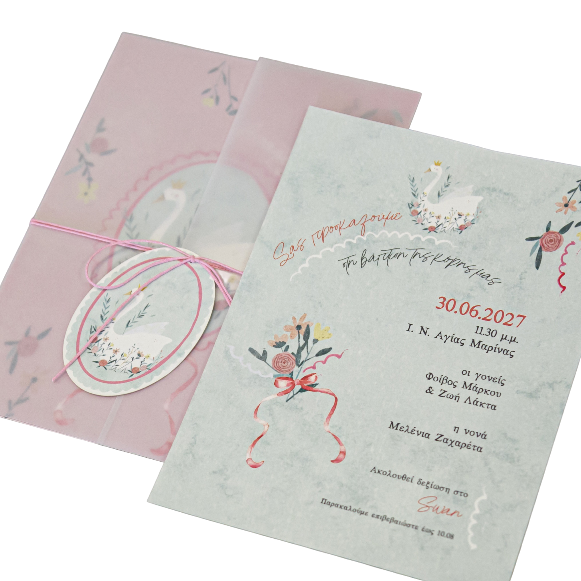 Προσκλητήριο βάπτισης για κορίτσι με θέμα κύκνο και φάκελο ριζόχαρτο.