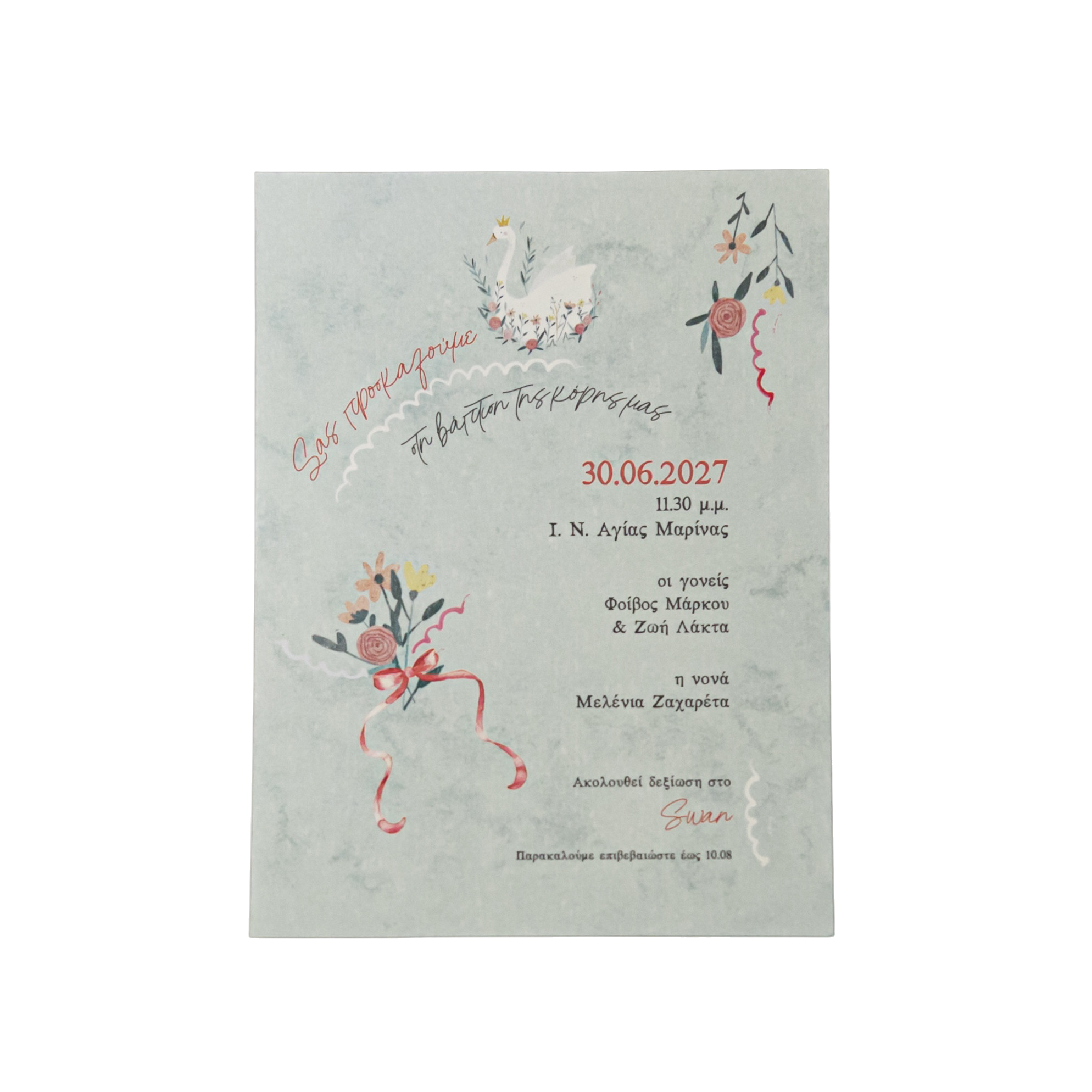 Προσκλητήριο βάπτισης για κορίτσι με θέμα κύκνος, ιδανικό για μια κομψή, ρομαντική και παραμυθένια εκδήλωση. Το σχέδιο περιλαμβάνει έναν elegant κύκνο, λουλούδια και απαλά διακοσμητικά στοιχεία που δημιουργούν μια ατμόσφαιρα τρυφερότητας, χάρης και φινέτσας.