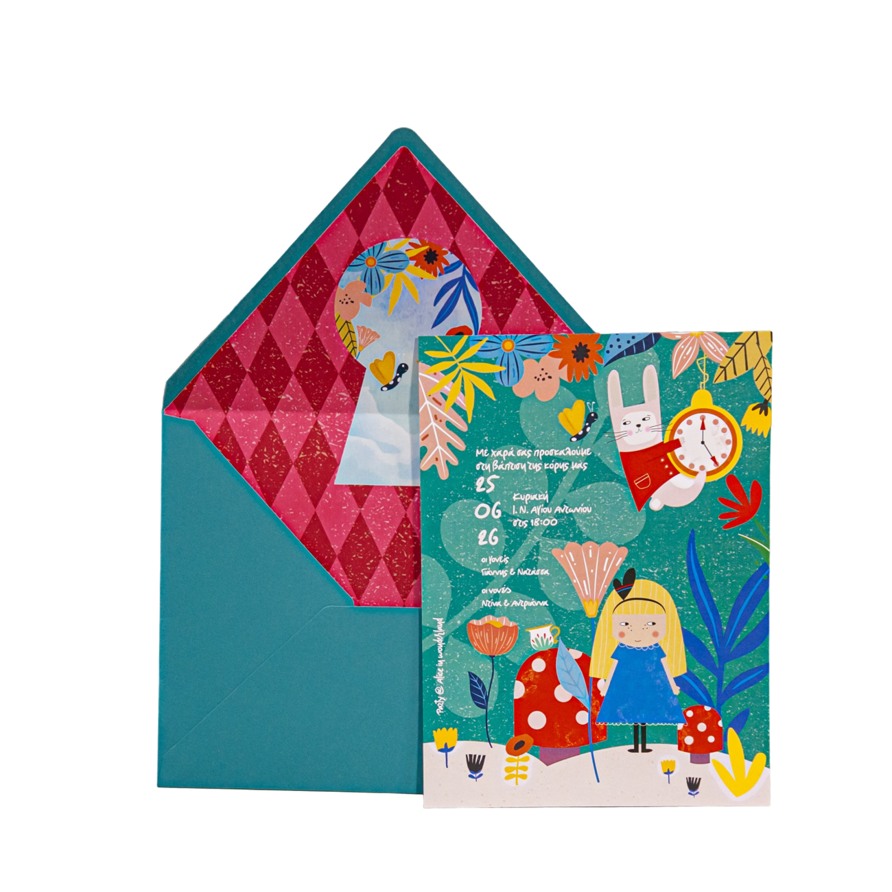Προσκλητήριο βάπτισης με θέμα Αλίκη στην χώρα των θαυμάτων.