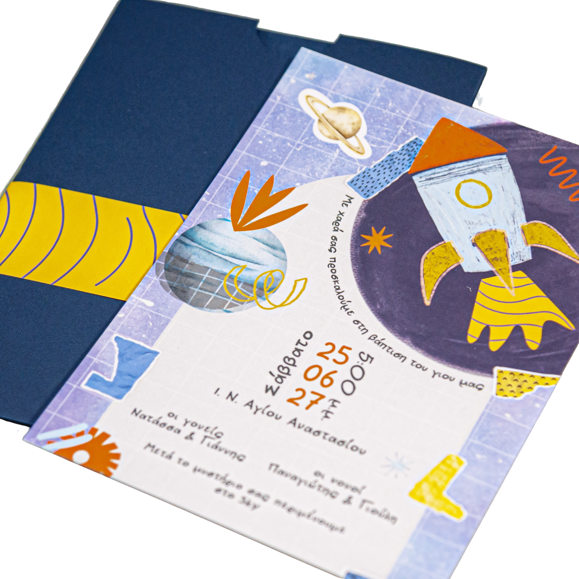 Προσκλητήριο βάπτισης με θέμα διαστημόπλοιο.