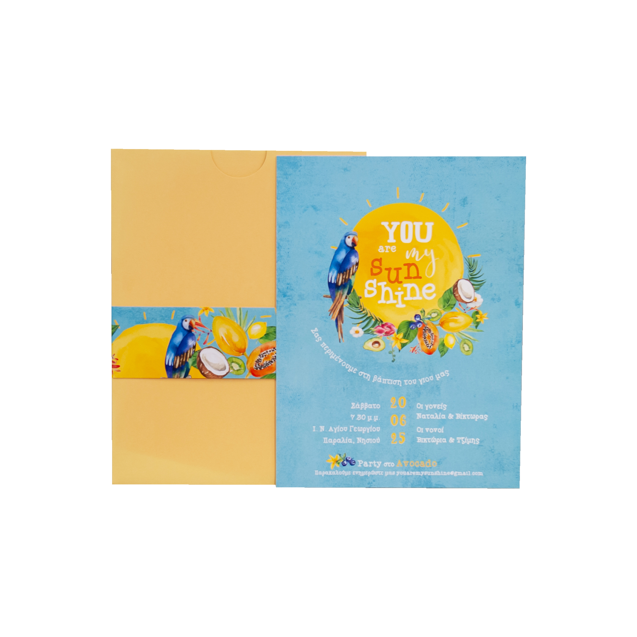 Προσκλητήριο βάπτισης με παπαγάλο και εξωτικά λουλούδια.