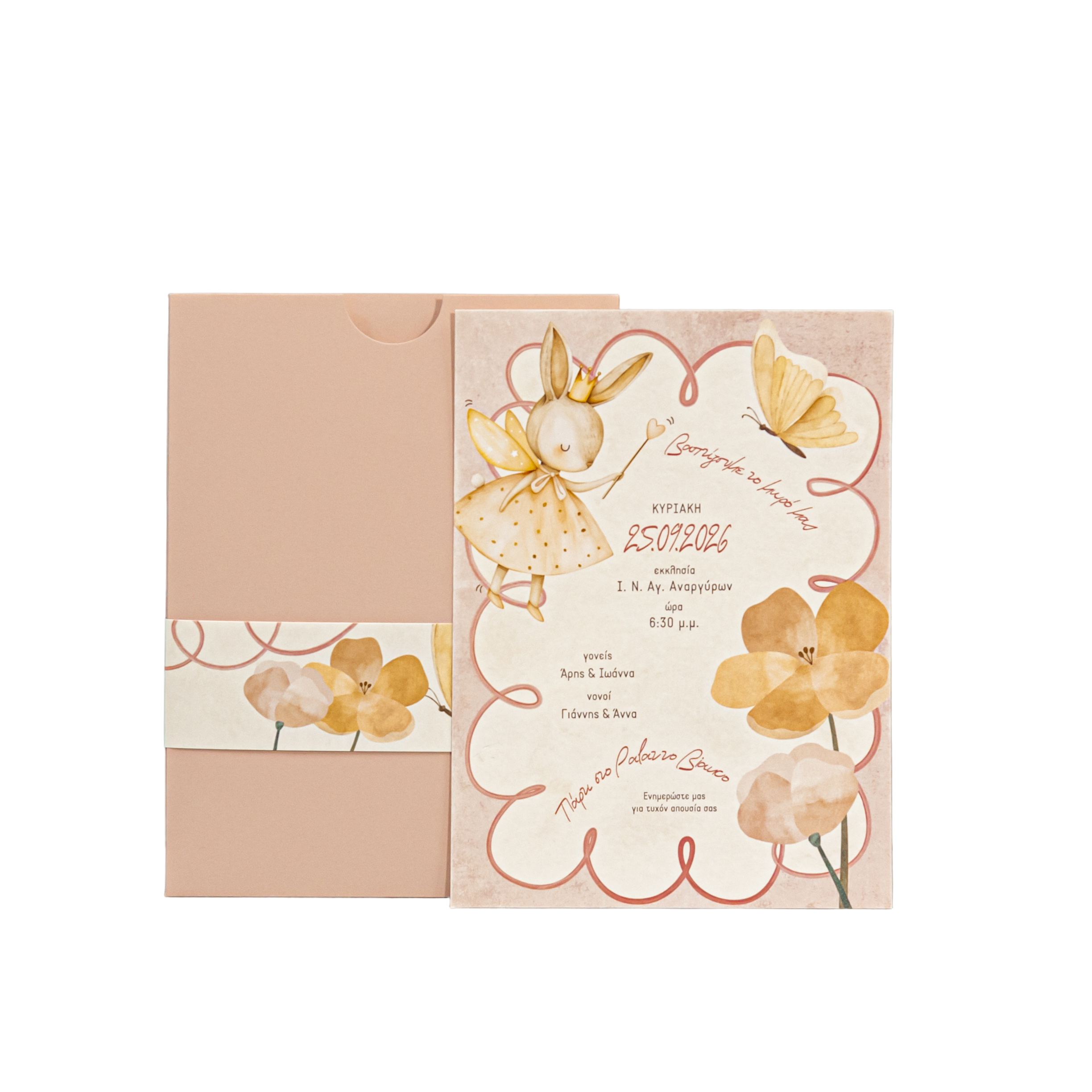 Προσκλητήριο βάπτισης με θέμα λαγουδάκι  με λουλούδια και πεταλούδες.