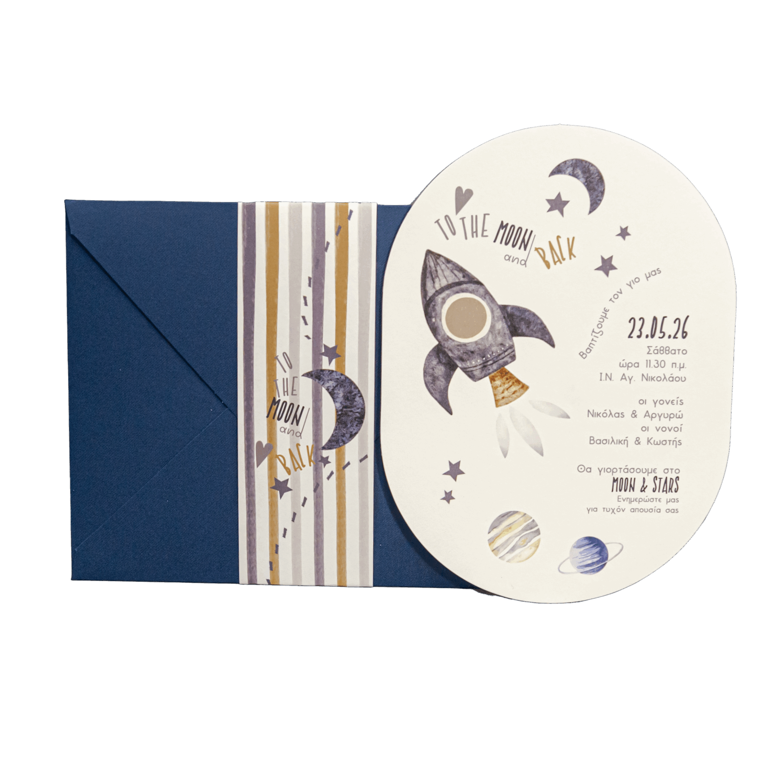 Προσκλητήριο βάπτισης με θέμα το διάστημα.