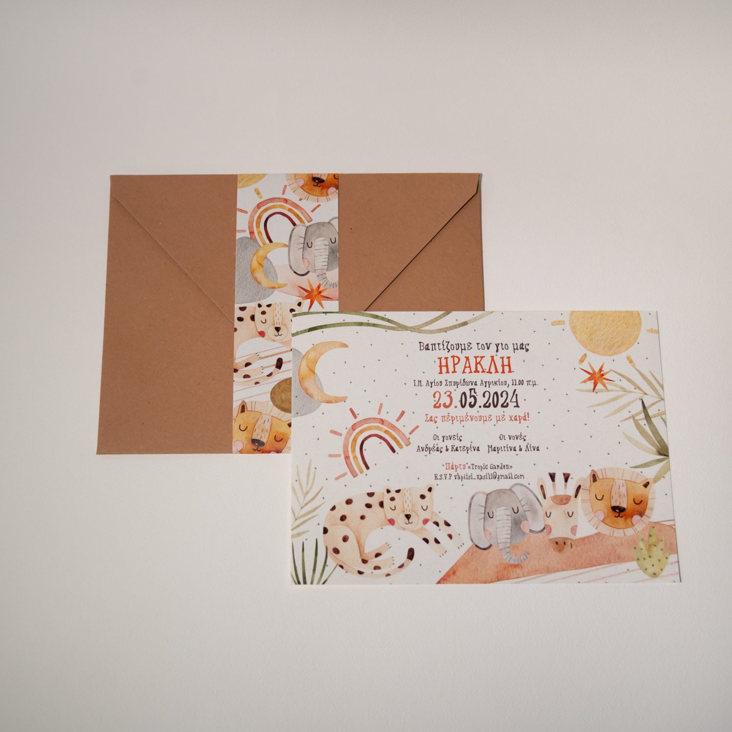 Προσκλητήριο βάπτισης με θέμα ζωάκια της ζούγκλας με φάκελο και τρέσα.