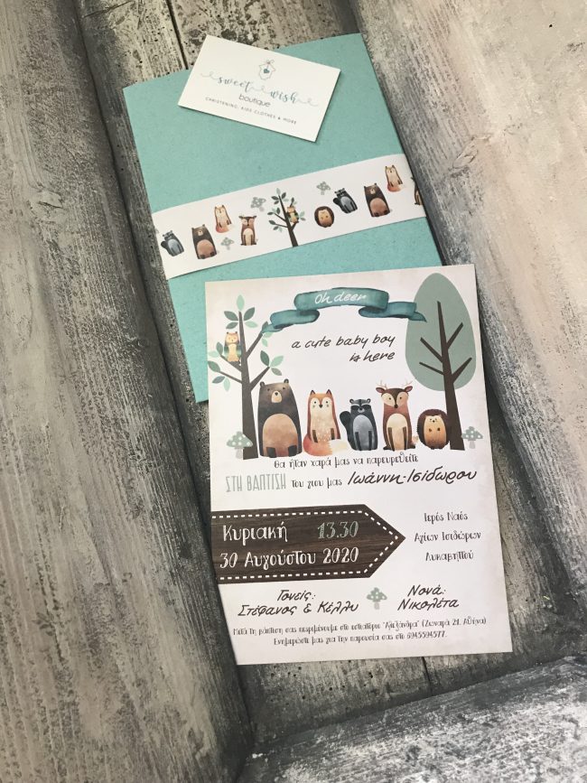 Προσκλητήριο βάπτισης με ζωάκια του δάσους.