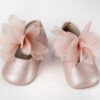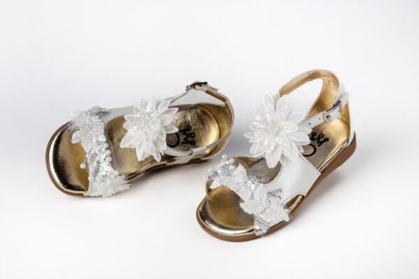 Σανδάλι περπατήματος από εκρού δέρμα διακοσμημένο με off white λουλούδι και κεντημένη δαντέλα, κλείσιμο με αγκράφα.