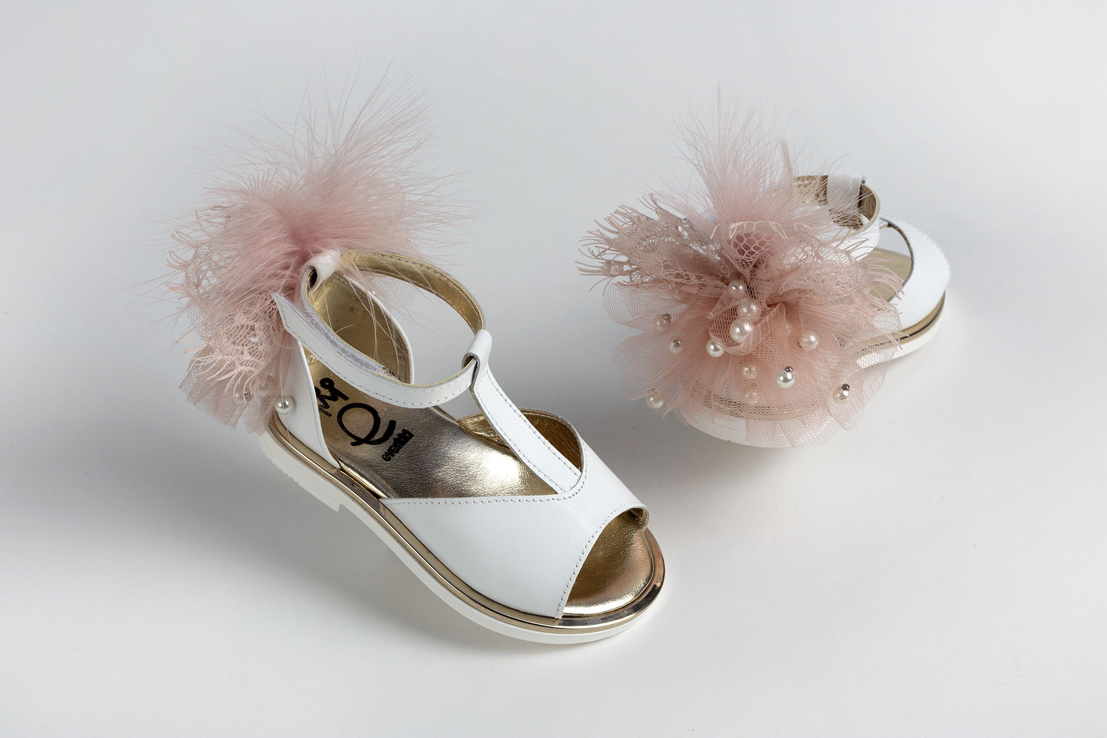 Σανδάλι περπατήματος σε λευκό δέρμα διακοσμημένο με τούλι και φτερά σε dusty pink και πέρλες everkid Κ546Α.