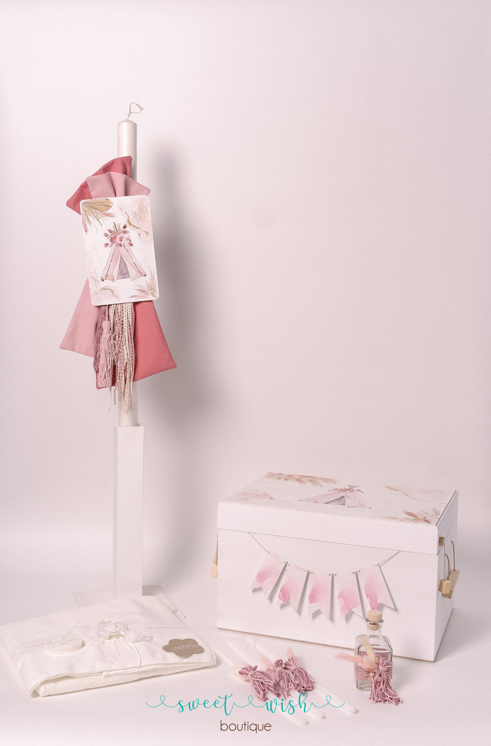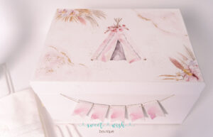 Σετ βάπτισης για κορίτσι με ξύλινο ζωγραφισμένο κουτί σε boho θέμα και pampas.