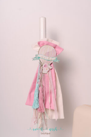 Σετ βάπτισης για κορίτσι με ξύλινο αερόστατο και υφάσματα σε ιβουάρ και ροζ χρώμα και αποχρώσεις σε ροζ και γαλάζιο χρώμα.