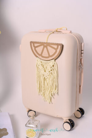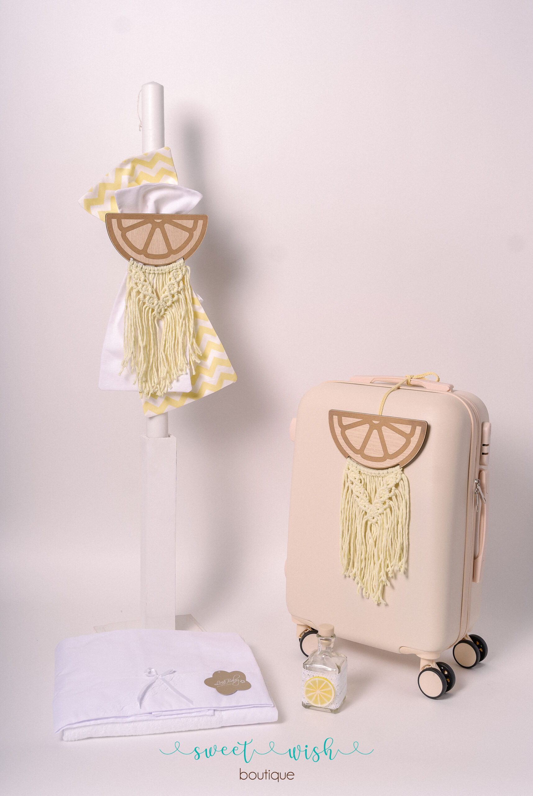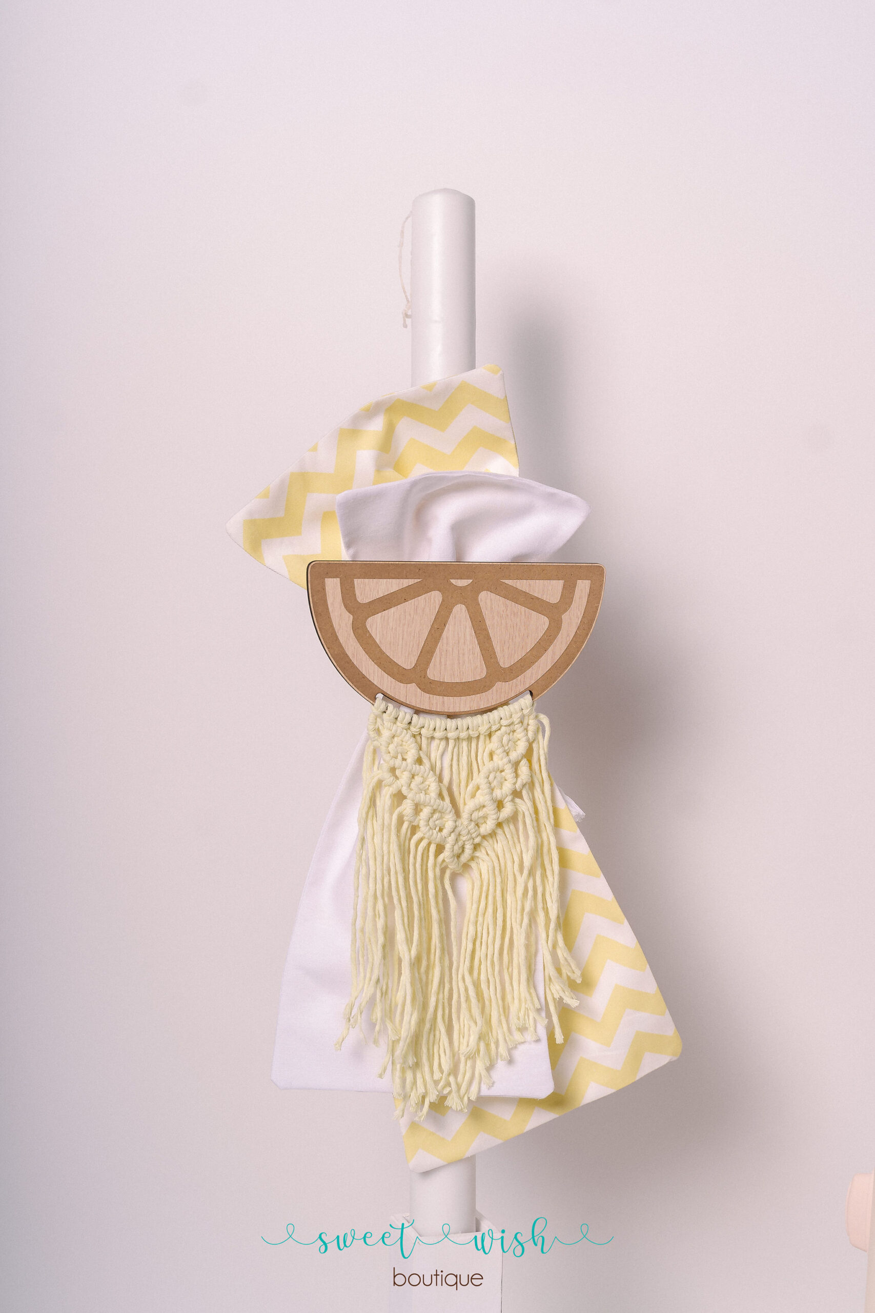 Σετ βάπτισης για κορίτσι με ξύλινο και κίτρινο μακραμέ λεμόνι.