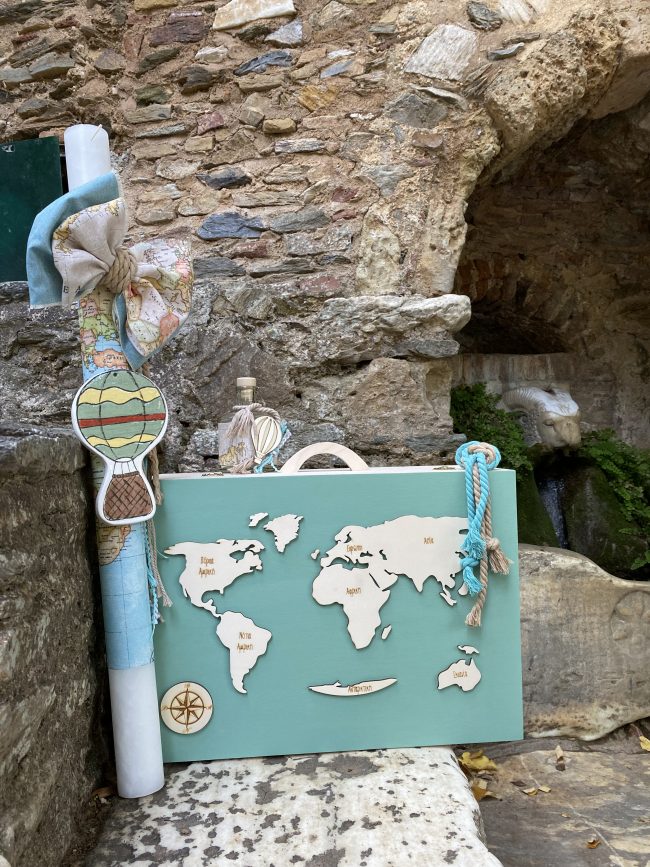 Σετ βάπτισης με θέμα το ταξίδι με ξύλινη βαλίτσα σε φυσικό ξύλινο με βαμμένο βεραμάν το εμπρός τμήμα και με κοπτικό τον παγκόσμιο χάρτη.