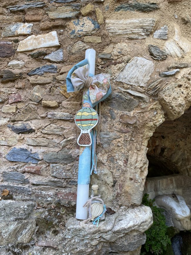 Η λαμπάδα είναι επίσης διακοσμημένη με υφάσματα με παγκόσμιο χάρτη και κεραμικό διακοσμητικό αερόστατο.