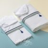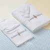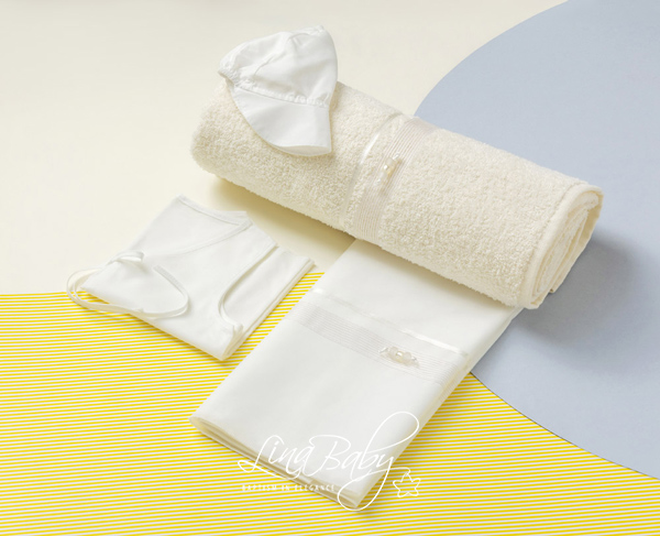 Ένα βαμβακερό σετ λαδόπανων υψηλής αισθητικής, σε λευκές και εκρού παραλλαγές, με σατέν κορδέλα και ριγέ οργαντίνα που αγκαλιάζουν το σχέδιο με αέρινη κομψότητα.