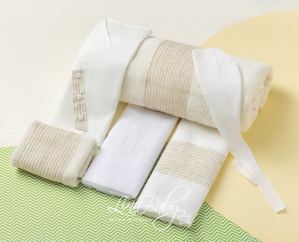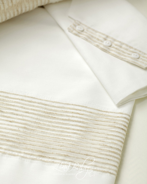 Εξαιρετικό βαμβακερό σετ λαδόπανων σε λευκό και εκρού, με φαρδιά φάσα από φίνα ριγέ οργαντίνα στους ίδιους απαλούς τόνους της βάσης.